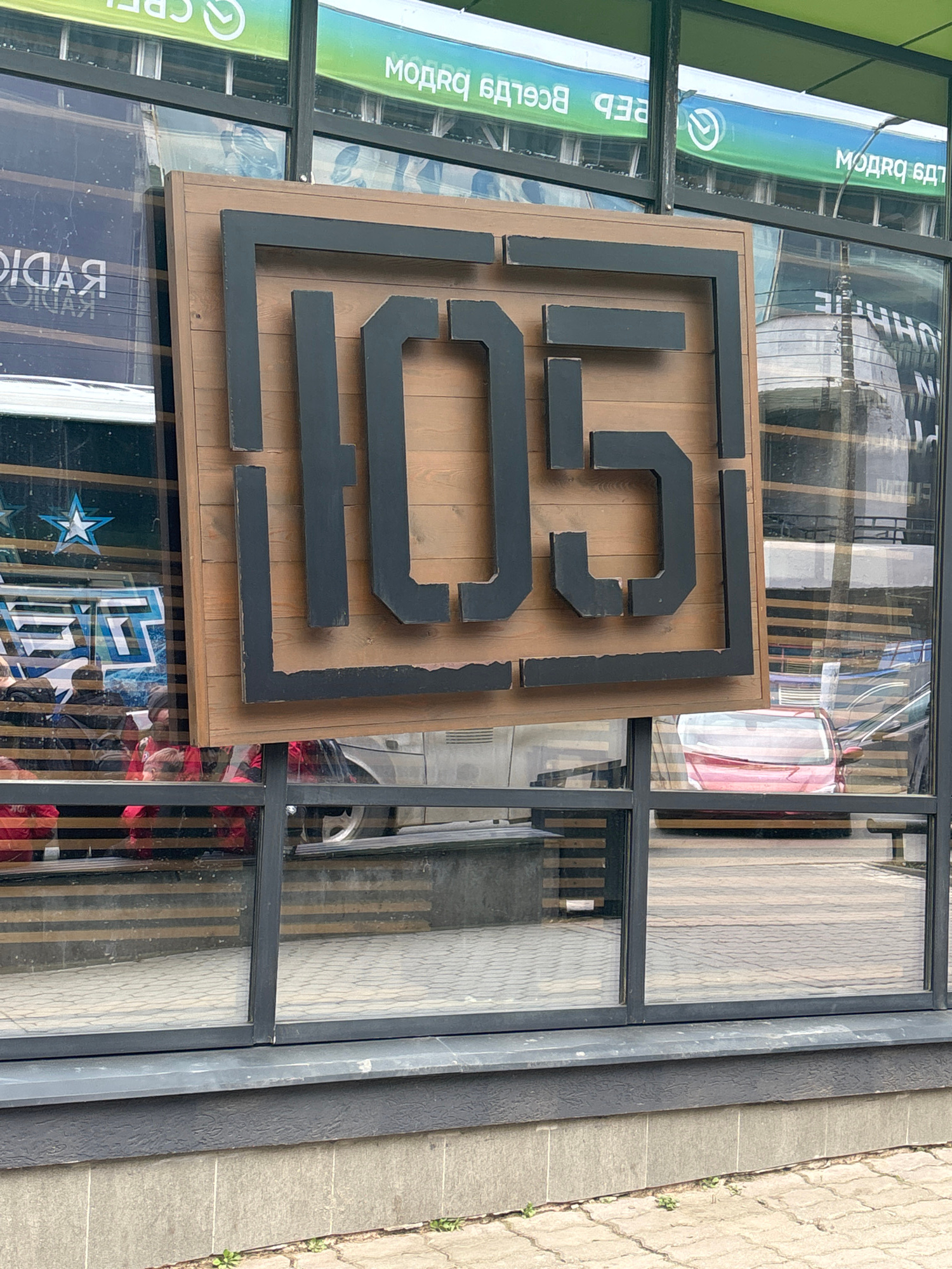 The image depicts a business establishment in Izhevsk, Russia, as evidenced by the Cyrillic text on the signage within the window. The storefront features a logo composed of bold, geometric black shap…read more