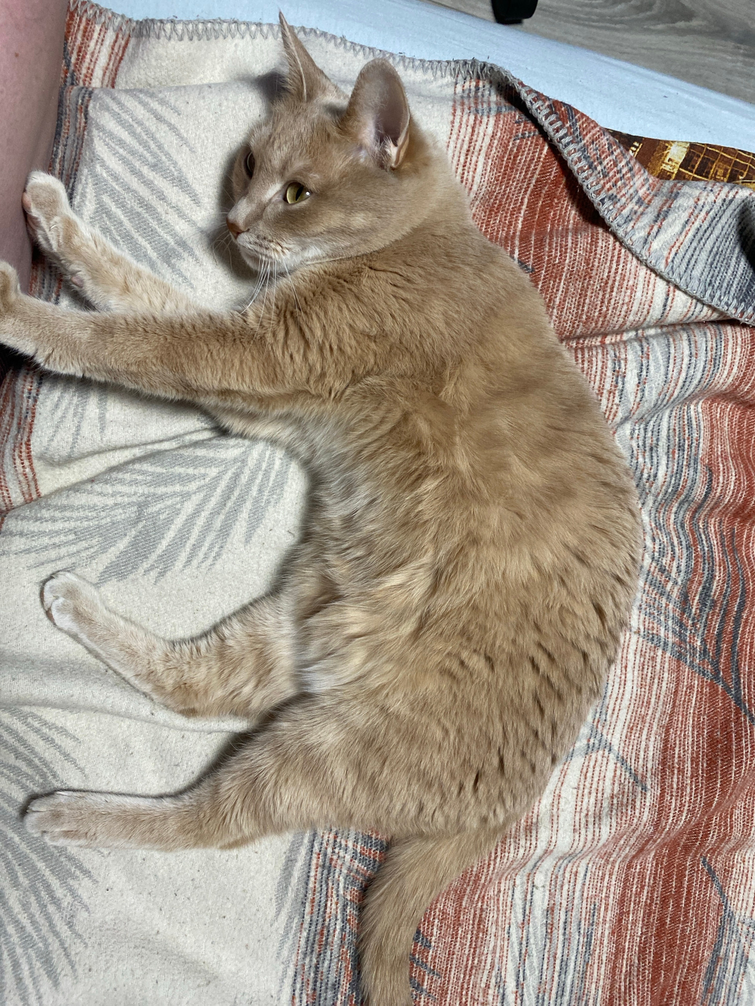 A tan cat is lying on a patterned blanket. The blanket has horizontal stripes of rust, gray, and white, along with a fern-like pattern in gray on a white background. The cat is stretched out, with itsβ¦read more