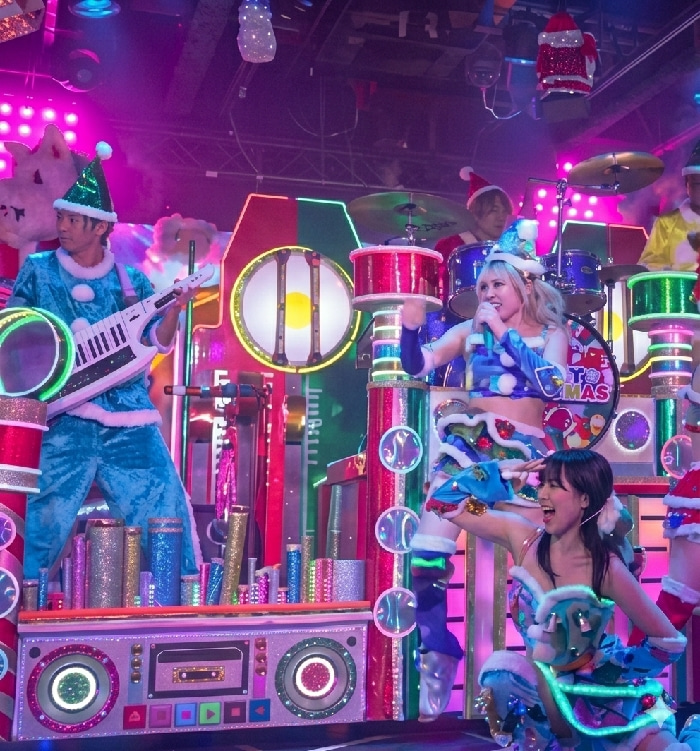 This image depicts a live musical performance occurring indoors in Shinjuku, Japan, set on a multi-tiered, vibrantly illuminated stage dominated by pink and purple lighting. Five individuals are visi…read more