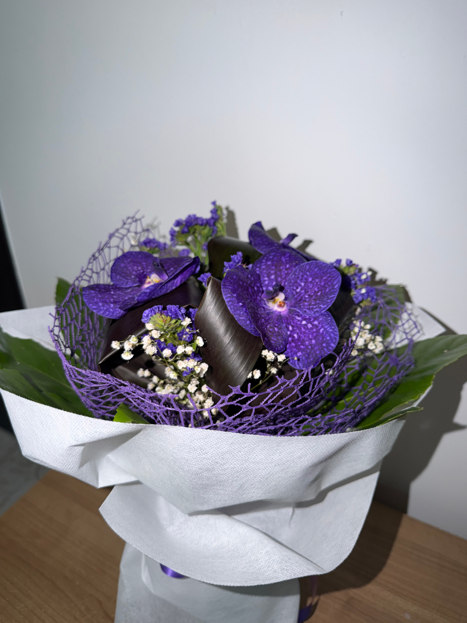 The image shows a bouquet of flowers. The bouquet includes purple orchids with spotted patterns, small white flowers resembling baby's breath, dark brown leaves, and green foliage. It is wrapped in pu…read more
