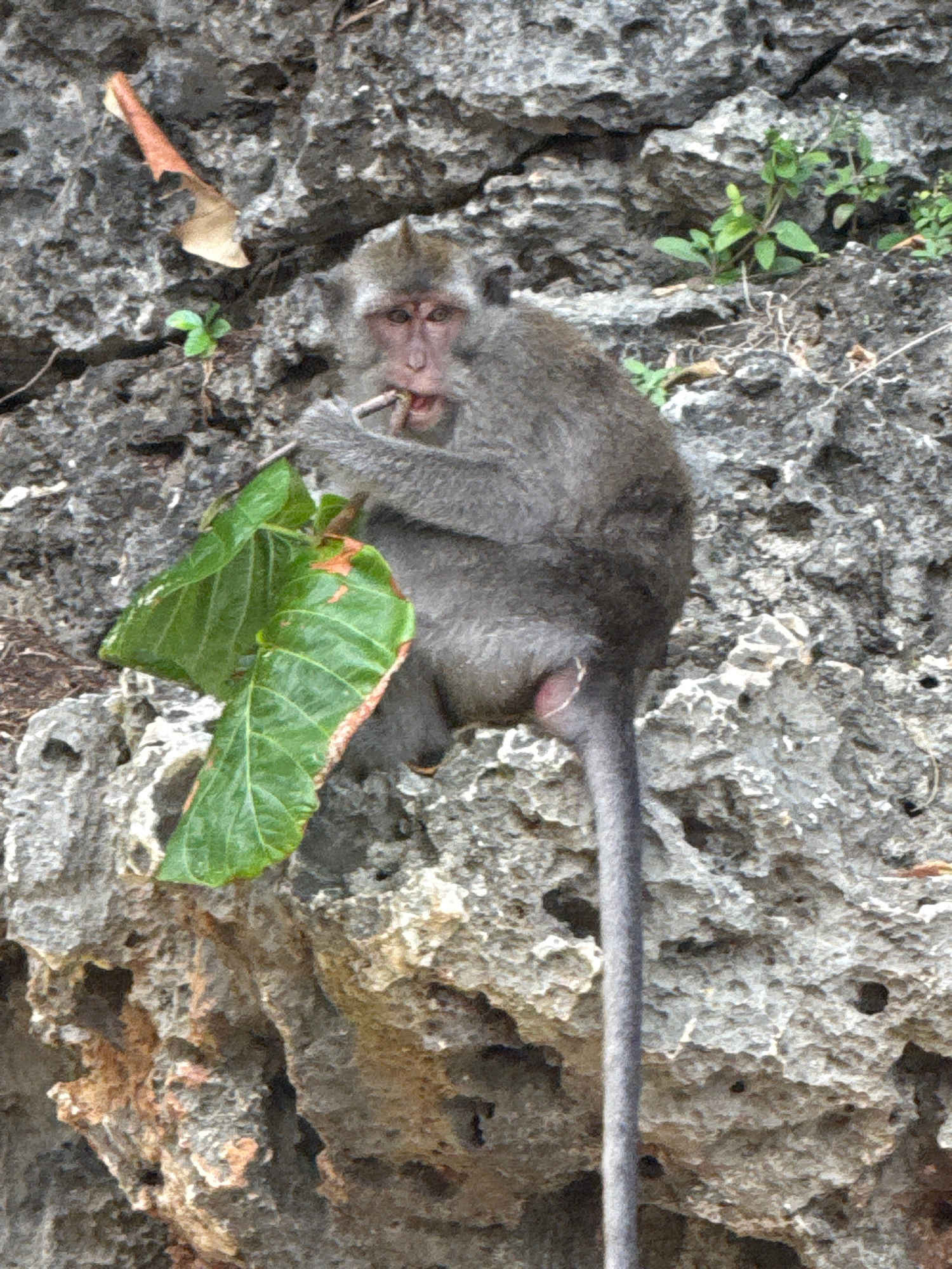 A monkey rests on a rocky surface. The monkey, which appears gray in color, is lying sideways, with its head near the bottom-left corner. A large green leaf is located near the monkey's underside. Sma…read more