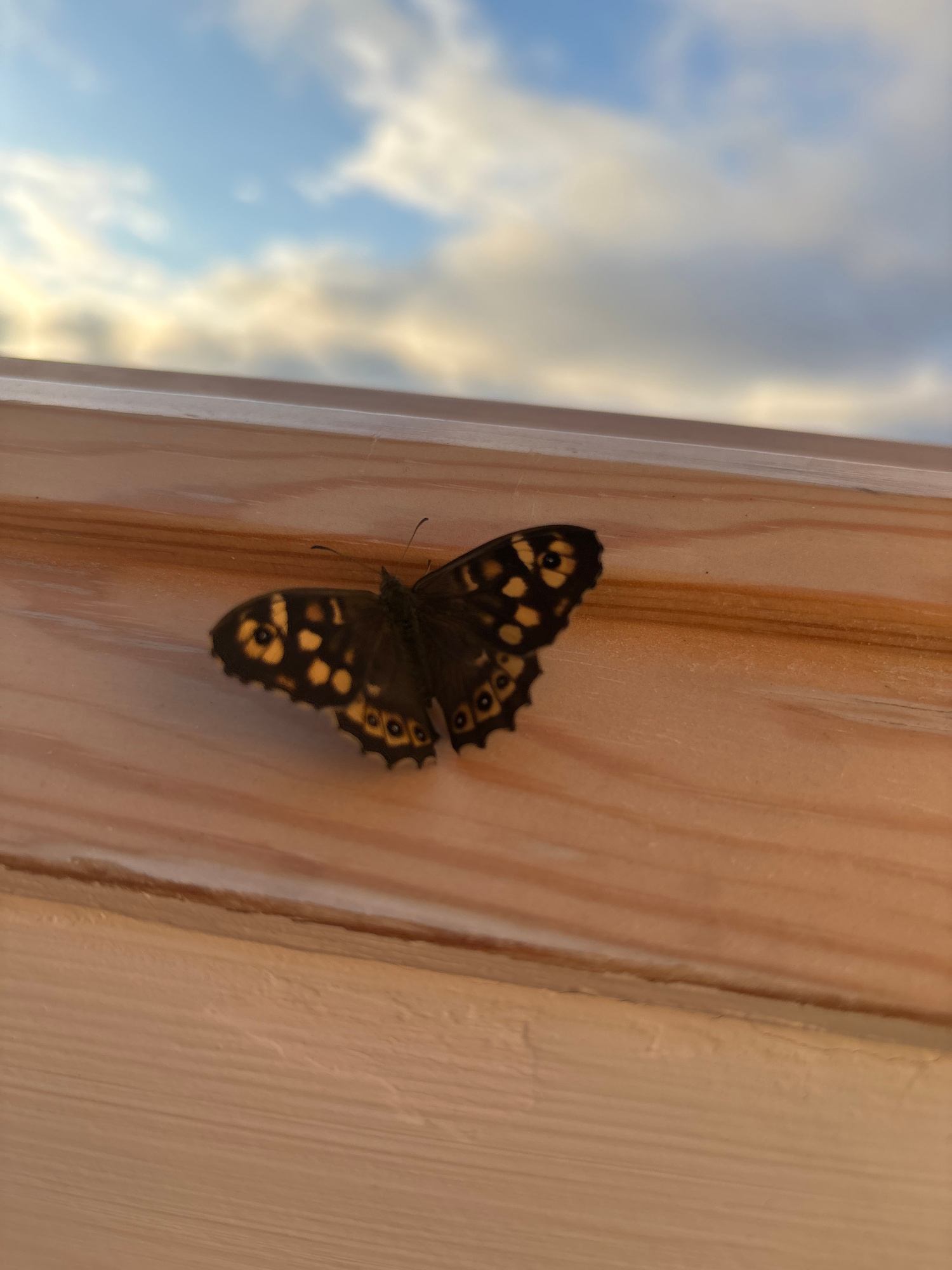 A butterfly with dark brown wings and yellow spots rests on a light brown wooden surface. The wings are partially open, revealing the intricate pattern of spots. The background is a blurred view of a…read more