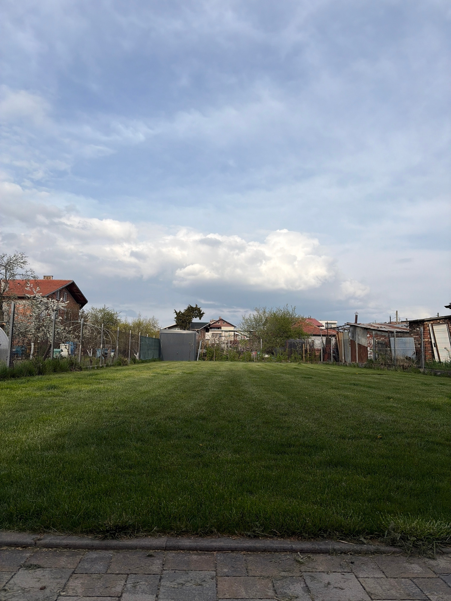 The image displays an outdoor scene in Sofia, Bulgaria, featuring a patch of green grass bordered by a paved path on the right. To the left, a mix of residential structures, sheds, and trees are visib…read more