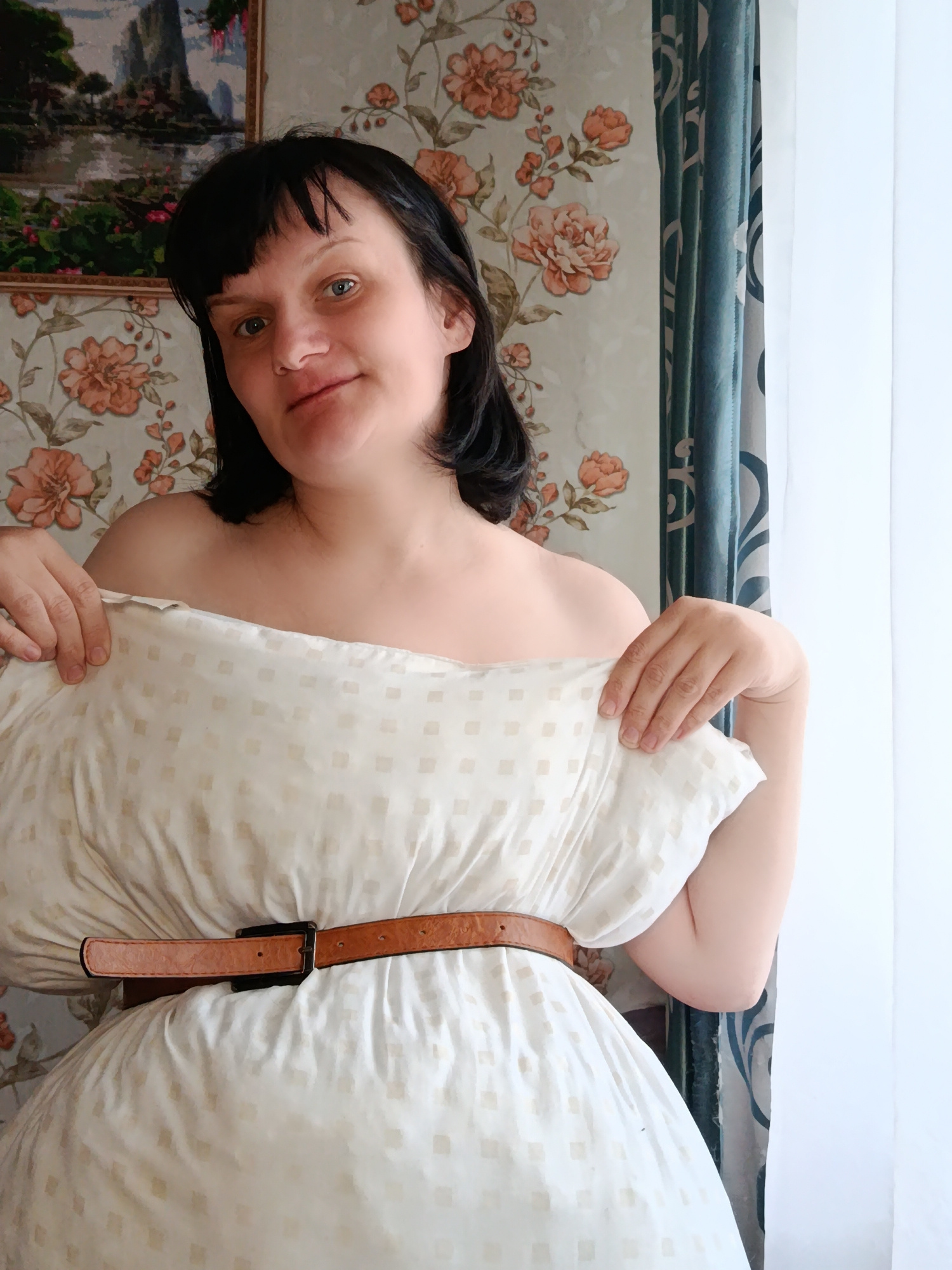 A woman with dark hair and bangs looks directly at the camera with a slight smile in an indoor setting in Фоки, Russia. She is participating in a "pillow challenge," using a large, off-white pillow wi…read more