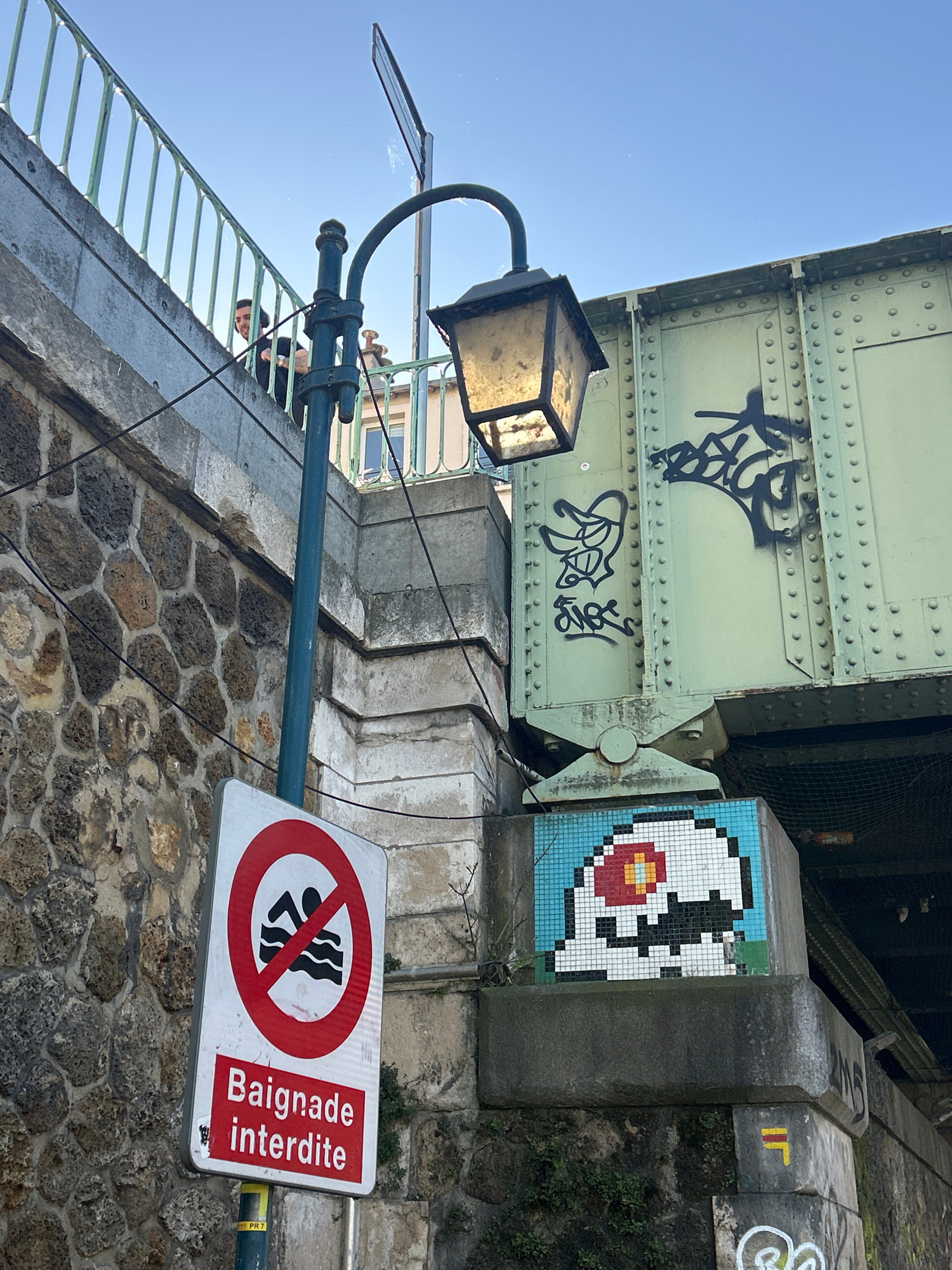The scene, likely in Pantin, France, depicts a low-angle view facing a bridge structure above a stone wall. A no swimming sign ("Baignade interdite") is prominently displayed, attached to a blue pole…read more