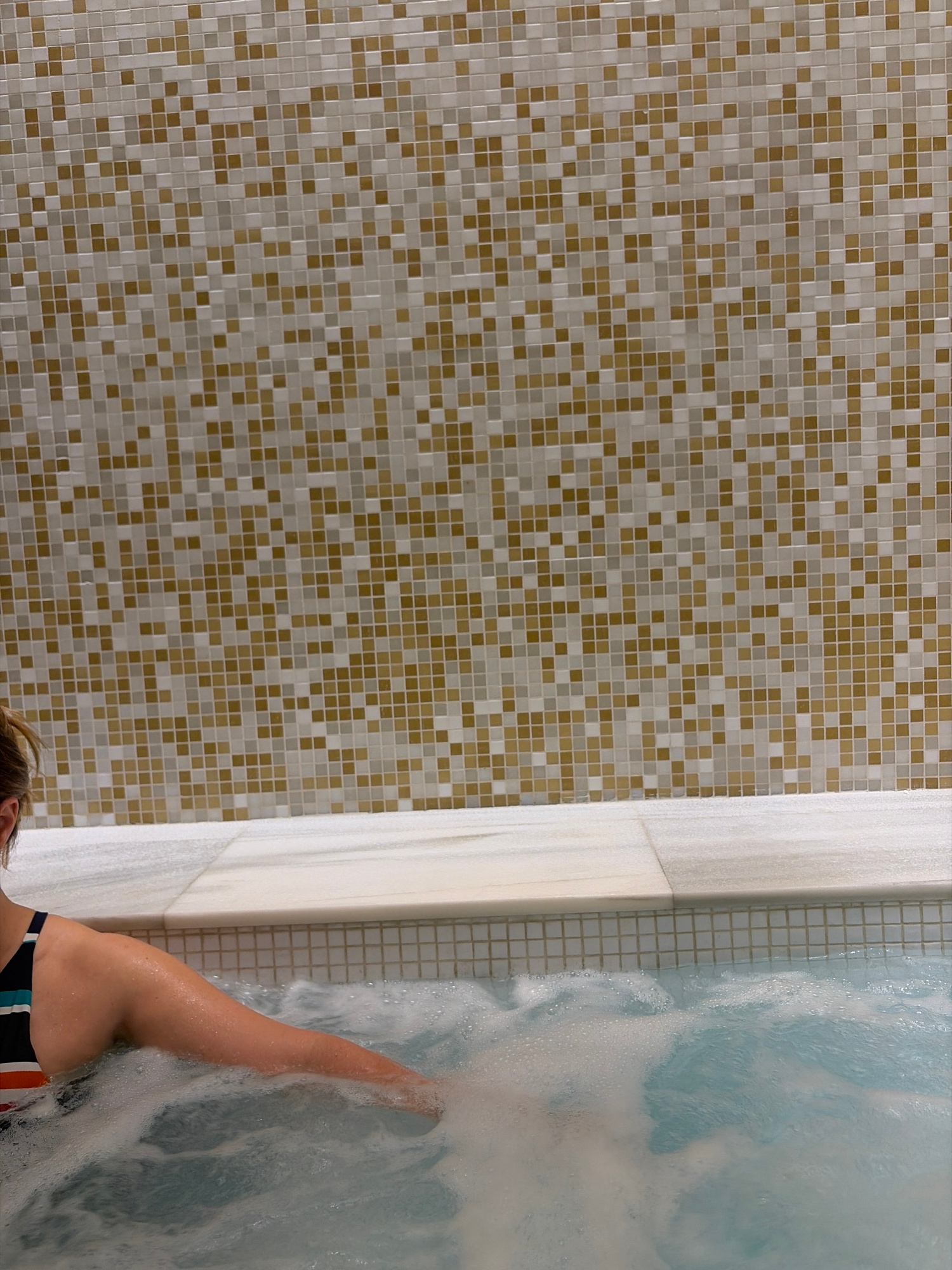 A high-angle shot reveals a person partially submerged in bubbling water, likely in a hot tub, with an arm extended into the water. The person's swimwear, which features stripes of blue, white, and or…read more