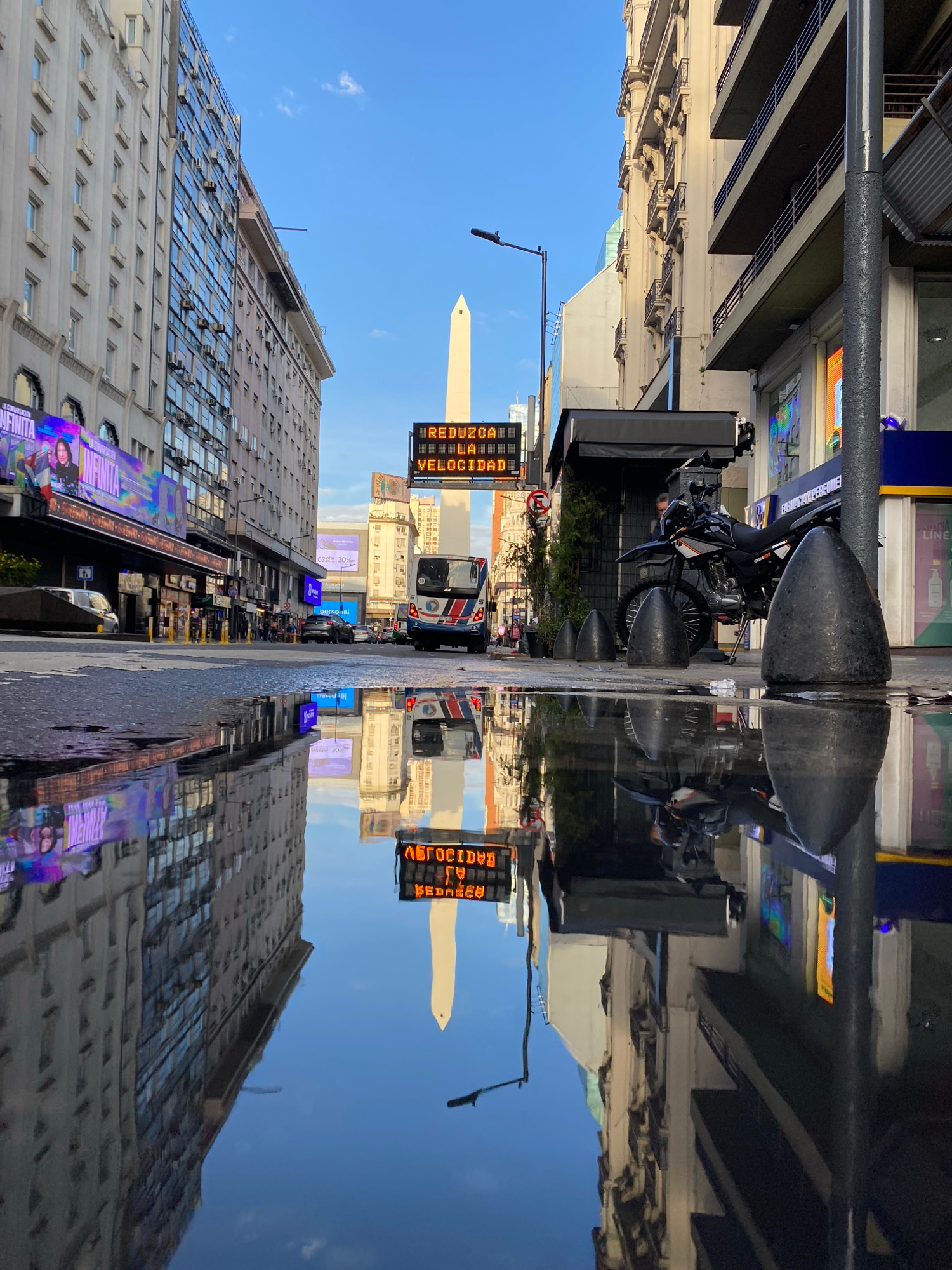 The image shows a reflection of a street scene in Buenos Aires, Argentina. The reflection seems to be from a wet surface or a glass panel. The Obelisco monument is visible in the background, along wi…read more