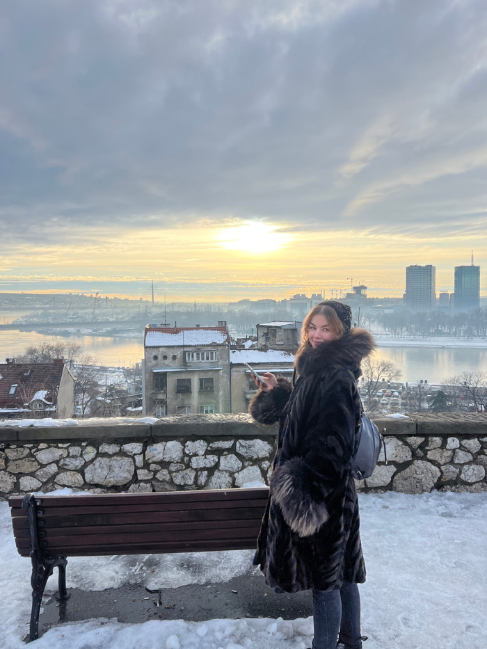 A young woman stands on a snow-covered overlook at Kalemegdan Fortress in Belgrade, Serbia, facing the camera and smiling. She wears a long, dark fur coat with a fur-lined hood and cuffs, a dark patte…read more