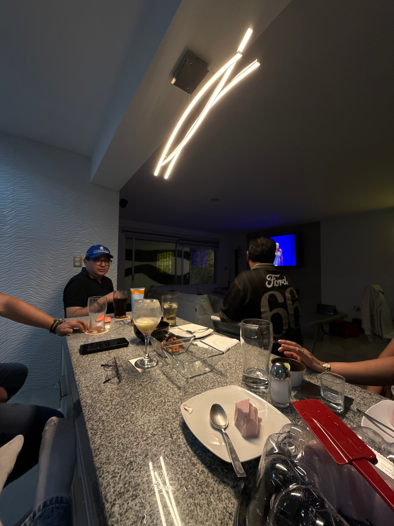 Here's a description of the image: **Scene:** An indoor gathering, possibly a dinner or party, in a modernly decorated room. **Location:** Santa Clara Ocoyucan, Mexico **People:** * Several indiv…read more