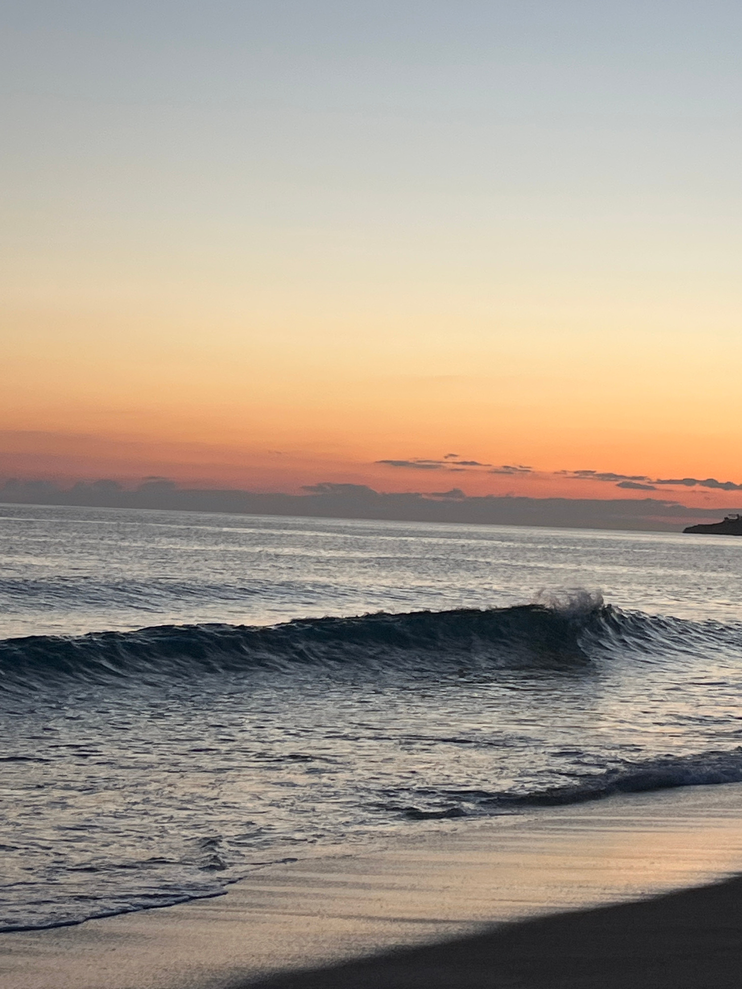The image captures a seascape at sunset in Alanya, Turkey. The scene presents a wide beach to the right, with a textured pattern indicative of wet sand. Waves are visible along the shore, with water r…read more