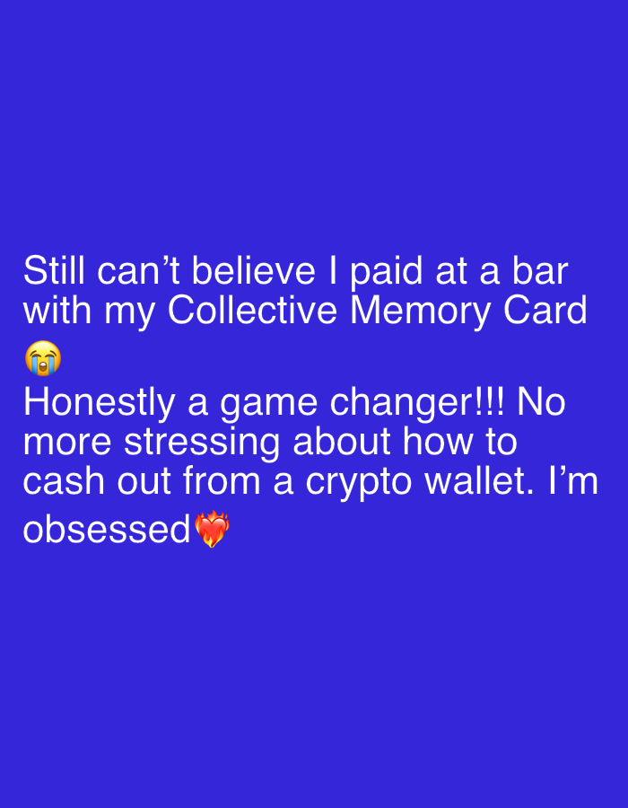 The image is a digital post with a blue background and white text. The text reads: "Still can't believe I paid at a bar with my Collective Memory Card." A crying emoji is present. The post continues,…read more