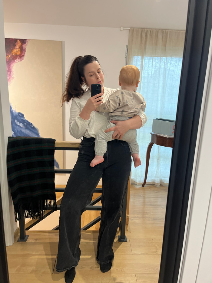 An adult female and an infant are captured in a mirror selfie within an interior setting in Gangloff, Germany. The adult female, with dark hair tied in a high ponytail, wears a light-colored long-slee…read more