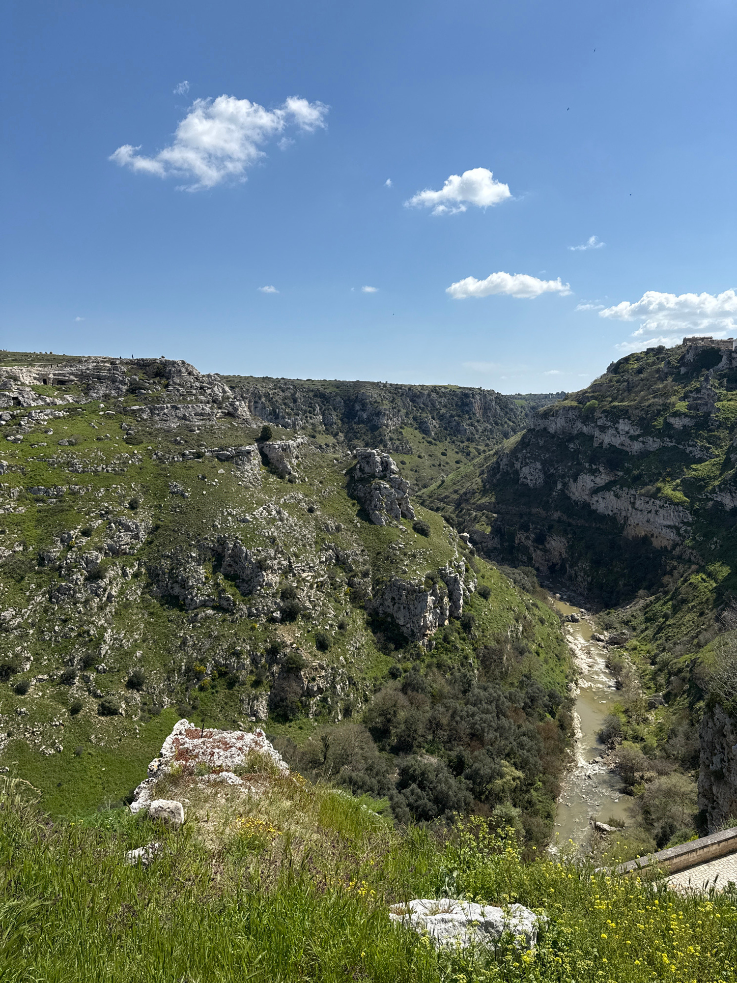 The image shows a vertical landscape of Matera, Italy. The foreground consists of grassy vegetation and rocky terrain. The middle ground features a steep cliff face, and a river running through the va…read more