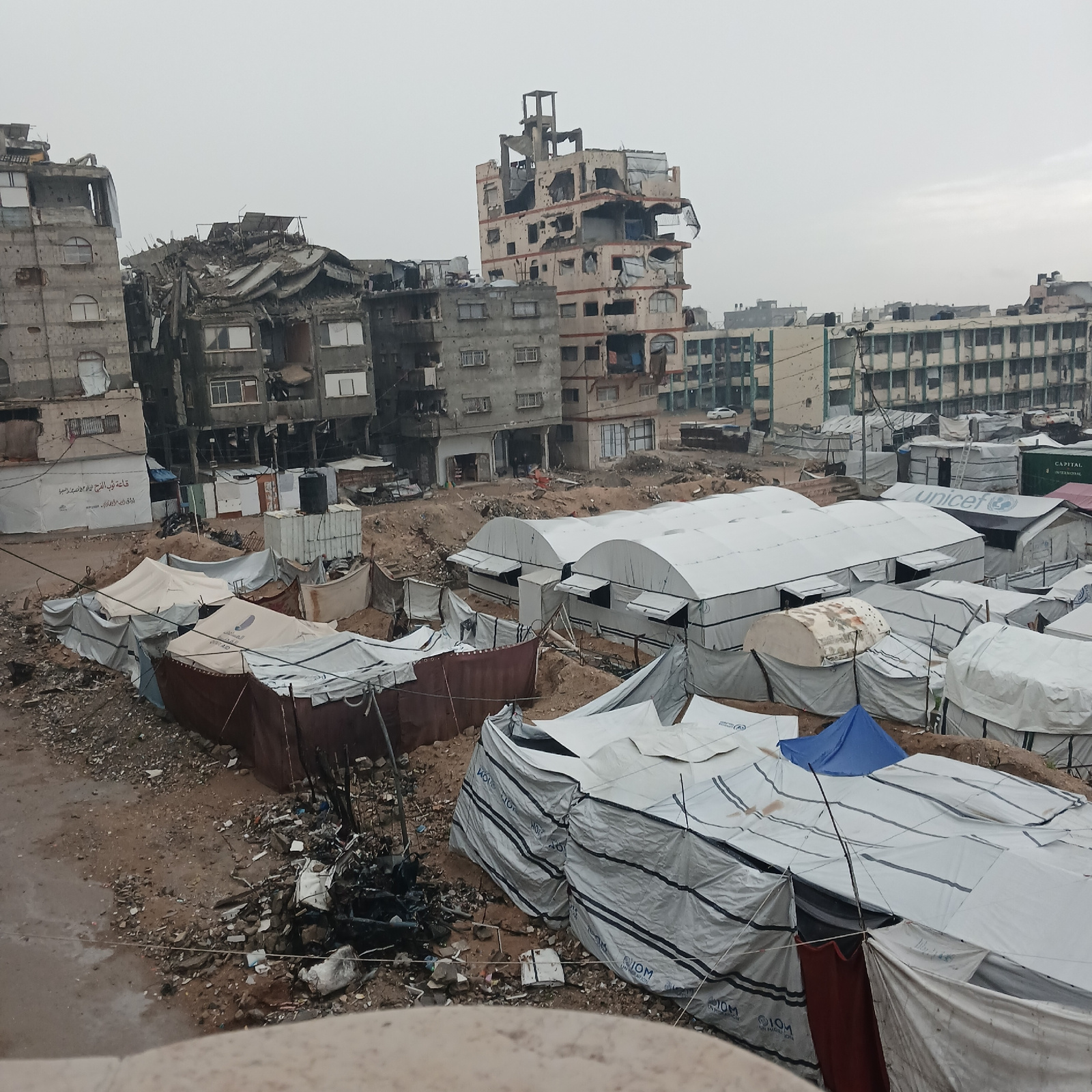 The image shows a devastated urban landscape, likely in the city of Gaza, Palestinian Territory. Buildings are severely damaged, with some reduced to rubble. Adjacent to the ruined structures, a makesβ¦read more
