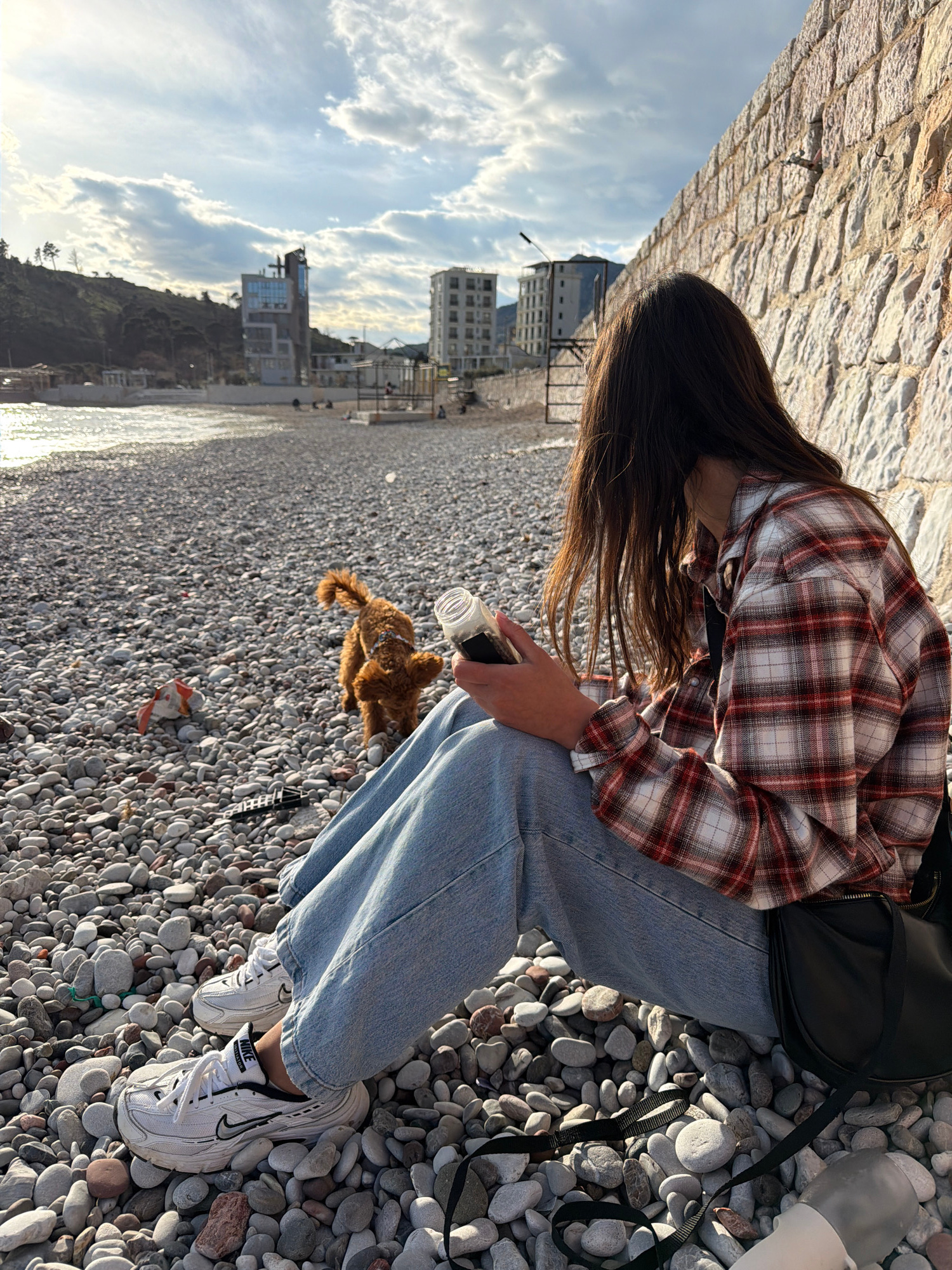 A person wearing a plaid shirt, blue jeans, and white Nike sneakers is seated on a pebble-covered beach. The person is holding a bottle and a stuffed animal. A black backpack sits beside the person. I…read more