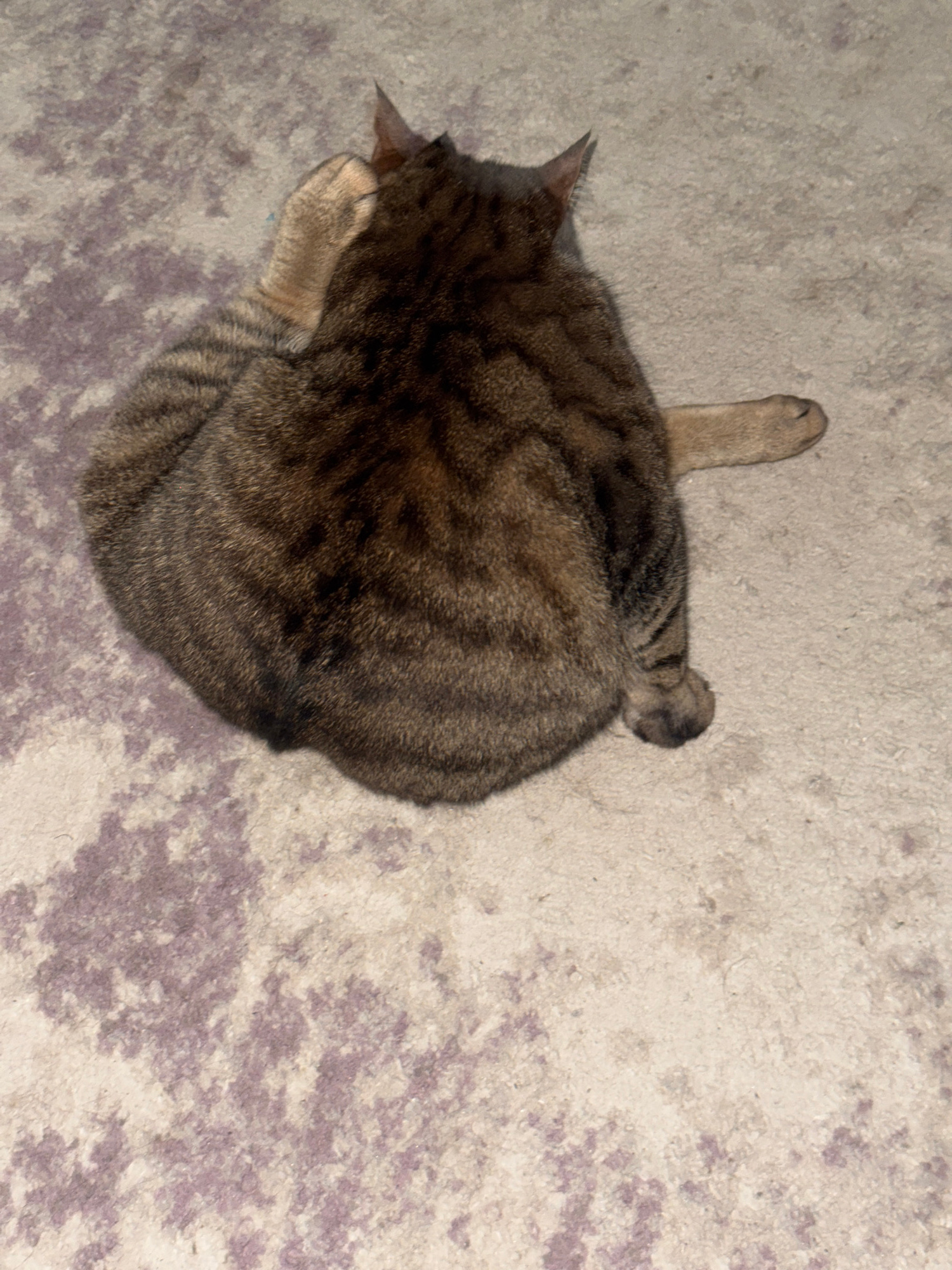 A brown tabby cat is curled up on a light-colored carpet. The cat's head is turned towards the left side of the frame, and its tail is curled around its body on the right side. One paw is extended upw…read more