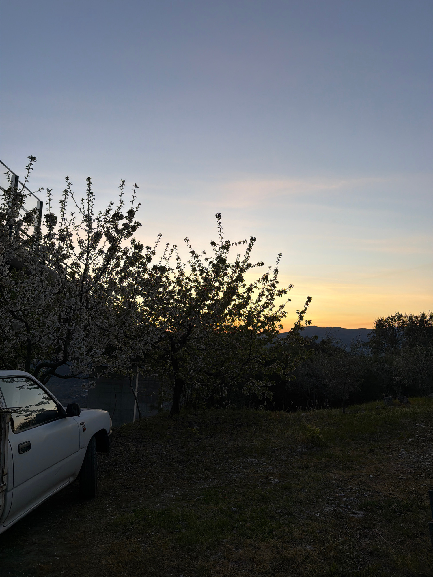 The image shows a sunset view over Vila Real, Portugal. The sky transitions from a pale blue to orange and yellow near the horizon, possibly obscured by distant mountains or hills. In the foreground i…read more
