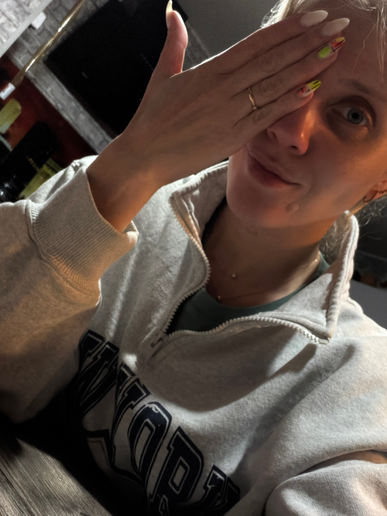 A medium shot shows a fair-skinned person partially obscuring their face with their hand, featuring almond-shaped nails with colorful designs on two of them, while wearing a ring on the ring finger. T…read more