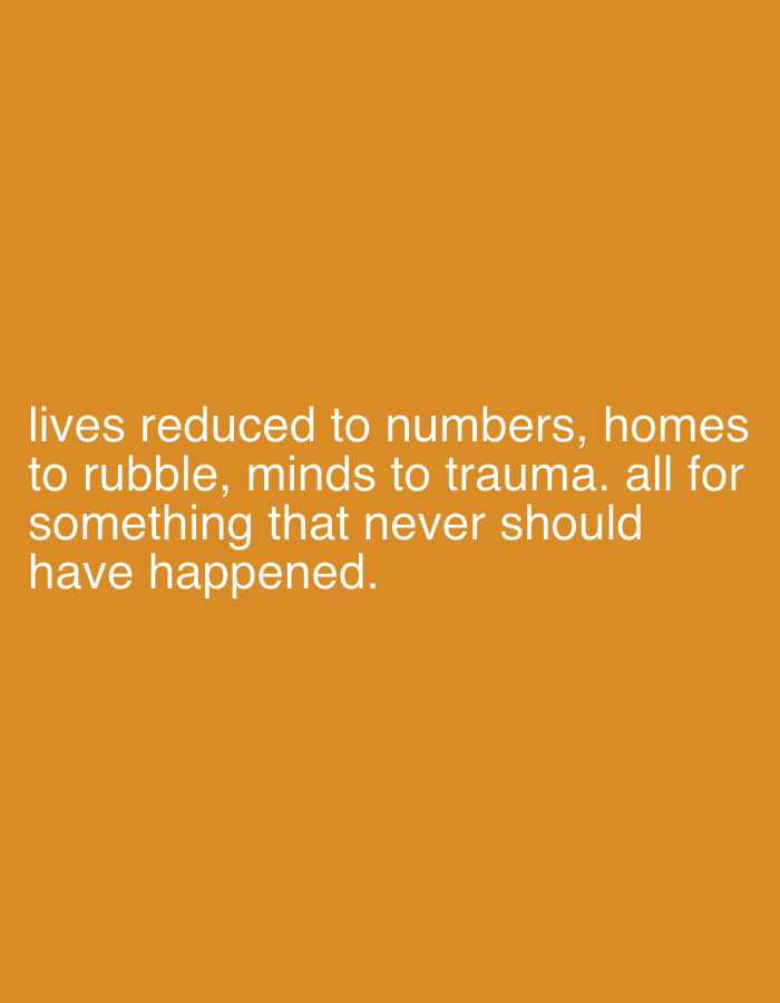 The image shows text on a solid orange background. The text reads: "lives reduced to numbers, homes to rubble, minds to trauma. all for something that never should have happened." The image does not c…read more