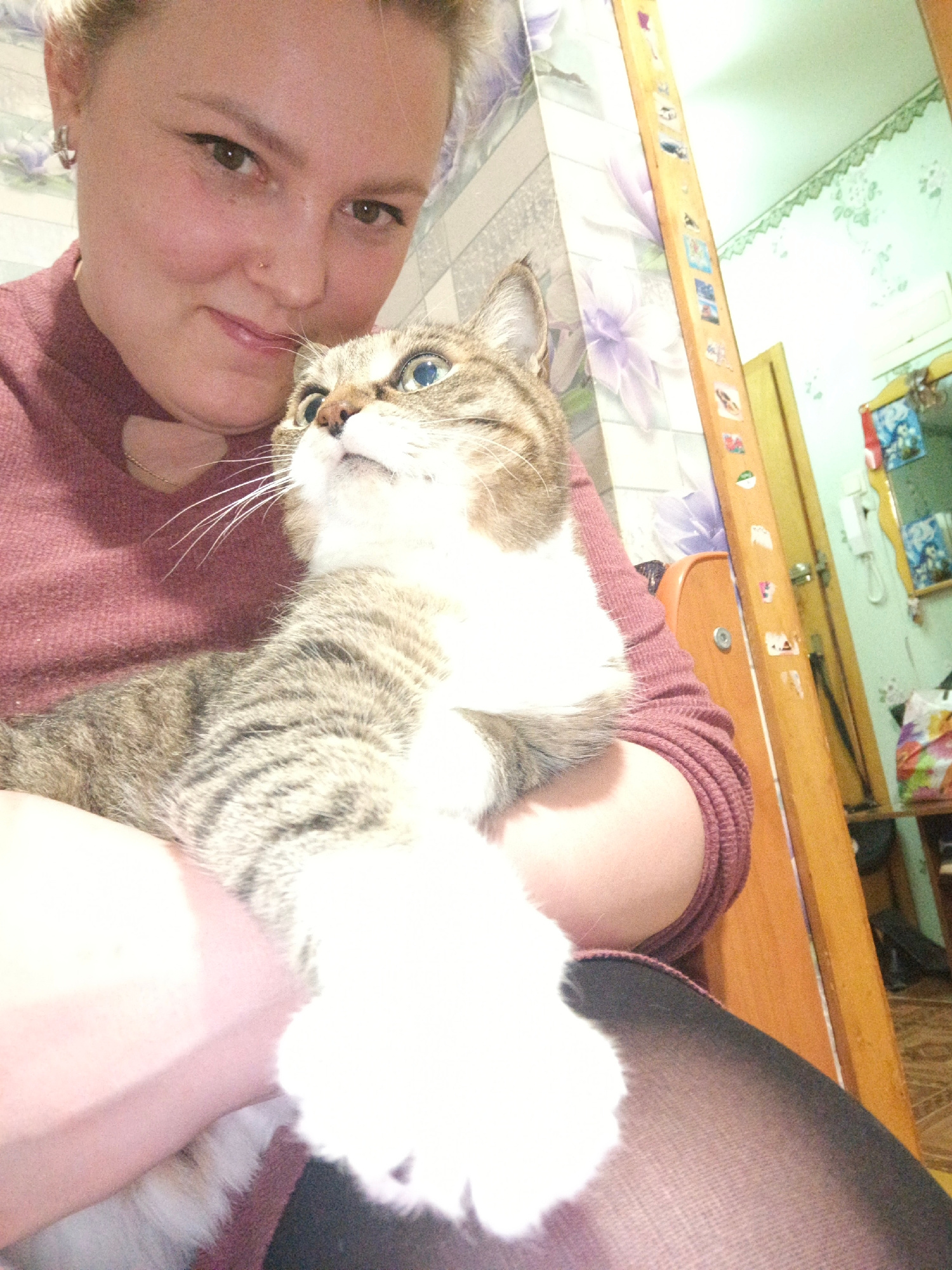 This media file captures a close-up, casual portrait of a woman holding a cat in an indoor setting in Марковский, Russia. The central subjects are a young woman and a domestic cat. The woman, who app…read more