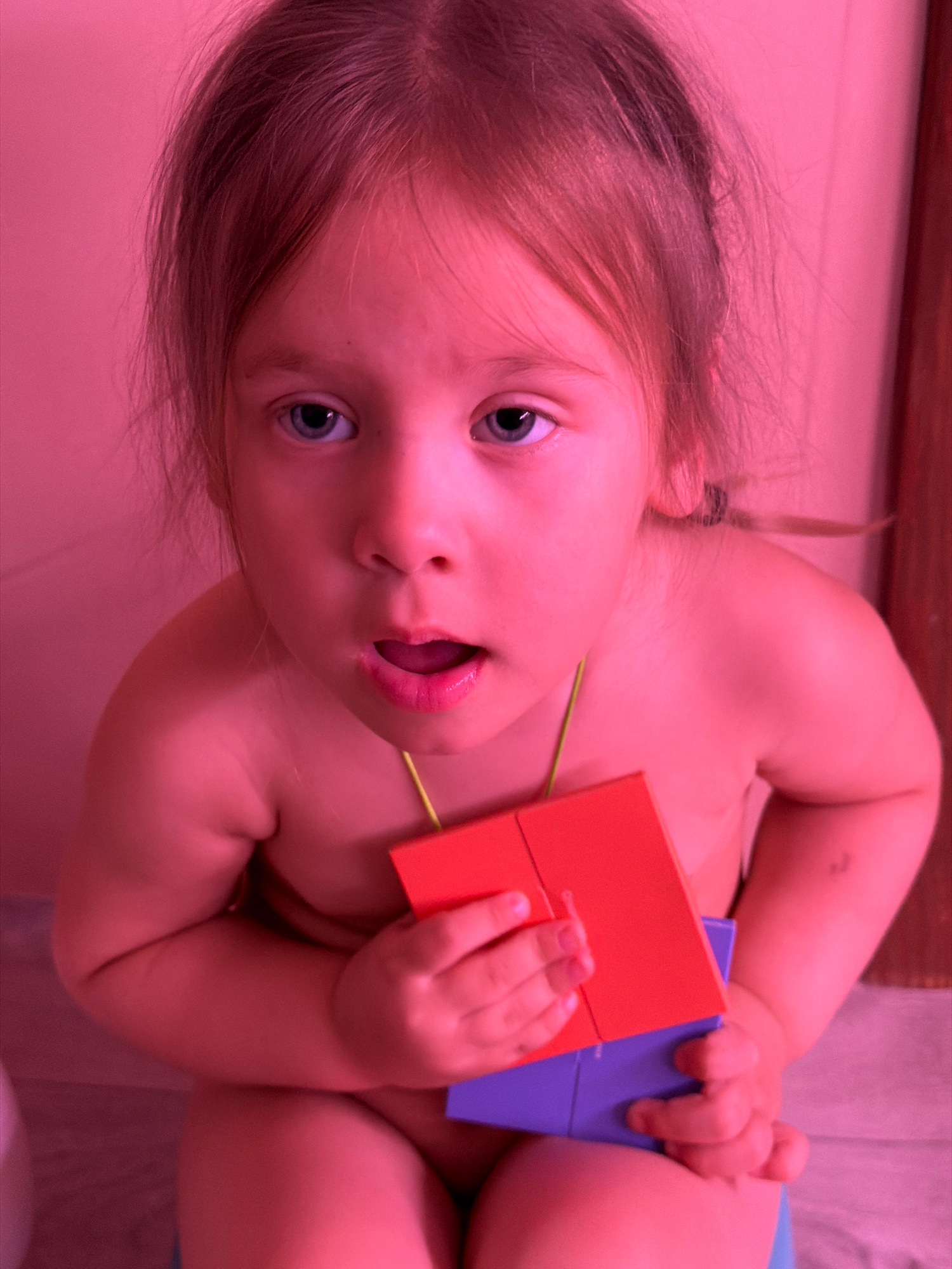 A close-up, slightly angled shot depicts a young child indoors. The child is fair-skinned with light brown hair pulled back into a small ponytail and striking blue eyes. The child's mouth is slightly…read more