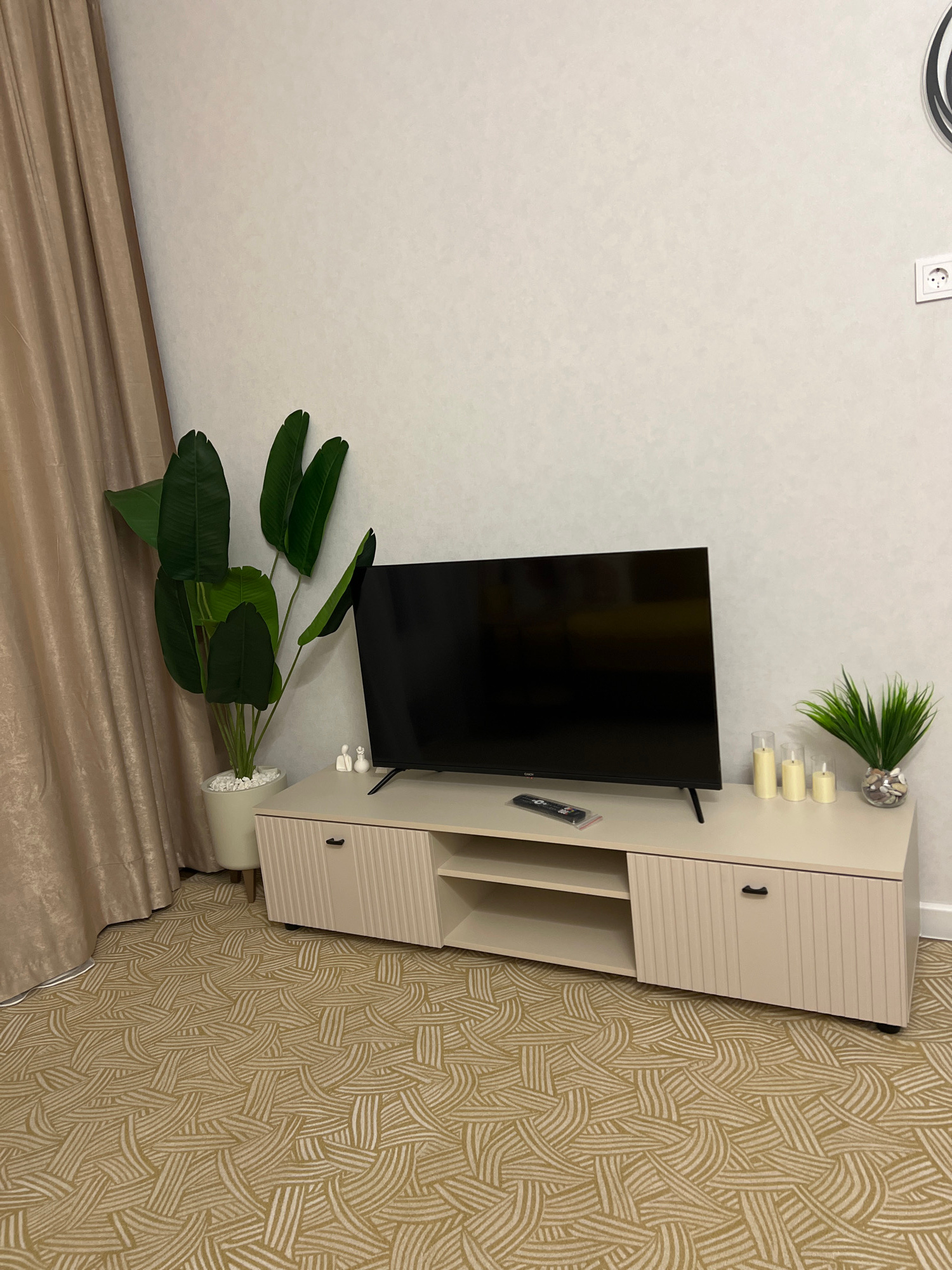 The scene depicts an interior setting in what appears to be a living room. A flat-screen television is mounted on a light beige cabinet that includes both closed storage with grooved facades and open…read more