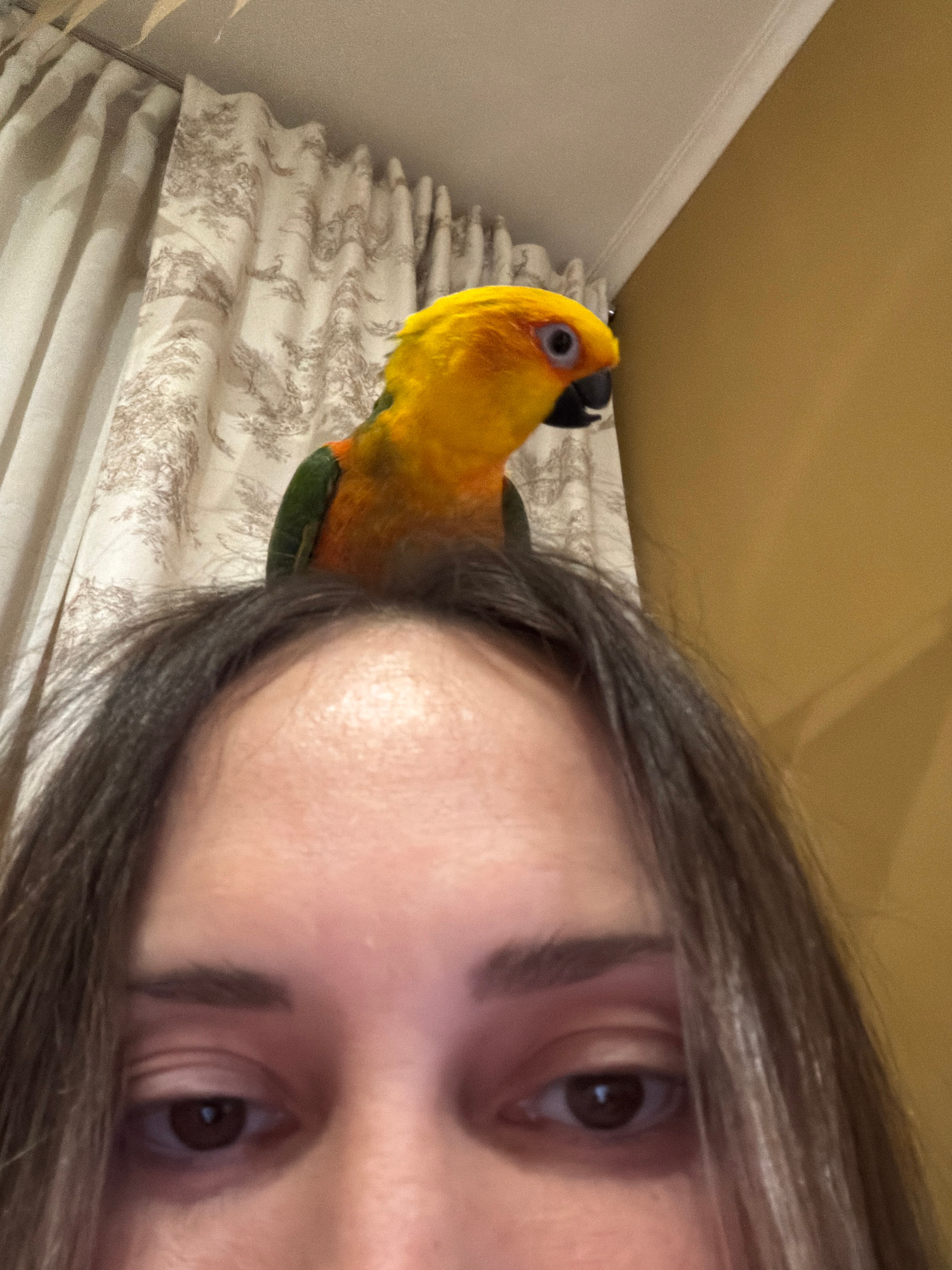 A close-up, rotated image depicts a person with dark brown hair and brown eyes. A colorful sun conure parrot perches near the person's head. The bird has a yellow head, orange chest, and green wings.…read more