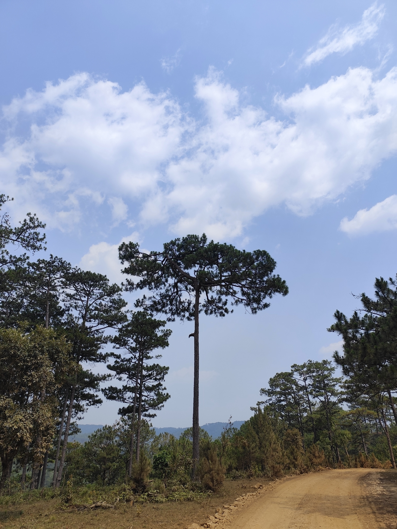 The image depicts a landscape in Lạc Dương, Vietnam, characterized by a dirt road leading through a forested area. The sky is blue with scattered cumulus clouds. Predominant trees are evergreen pines,…read more
