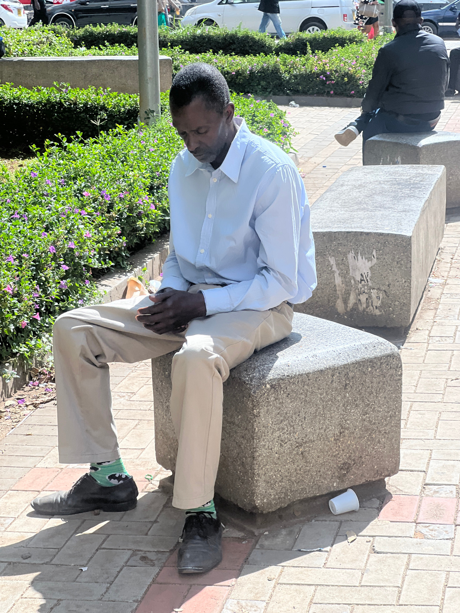 A man in a light blue shirt and khaki pants is sitting on a series of grey, concrete blocks. He appears to be sleeping. Another man is sitting on a block behind him, also appearing to rest. A white cu…read more