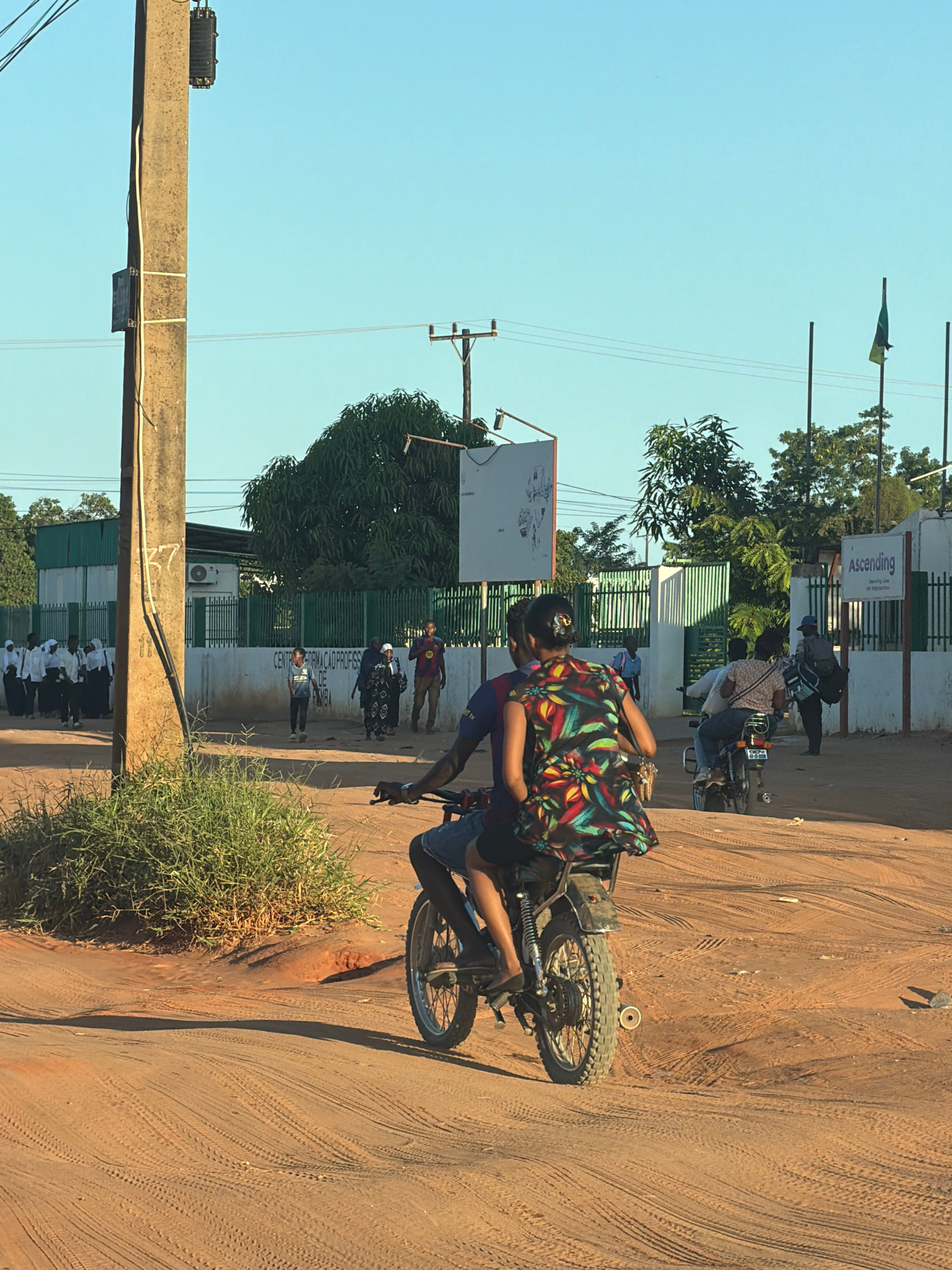 The image, taken in Pemba, Mozambique, depicts a vibrant street scene under a clear blue sky. The main thoroughfare is an unpaved, reddish-brown dirt road, showing distinct tire tracks from vehicles.…read more