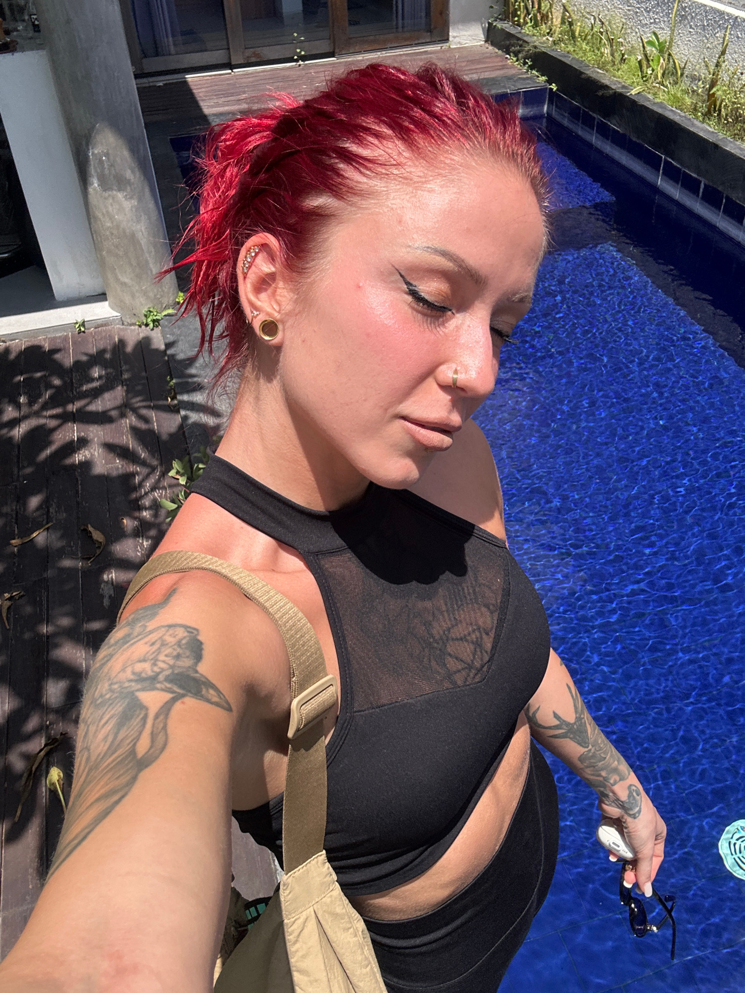 A woman is posing in an outdoor setting adjacent to a swimming pool. She has red hair and fair skin. She is wearing a black mesh top, dark bottoms, and a light tan shoulder bag strap is visible. The w…read more