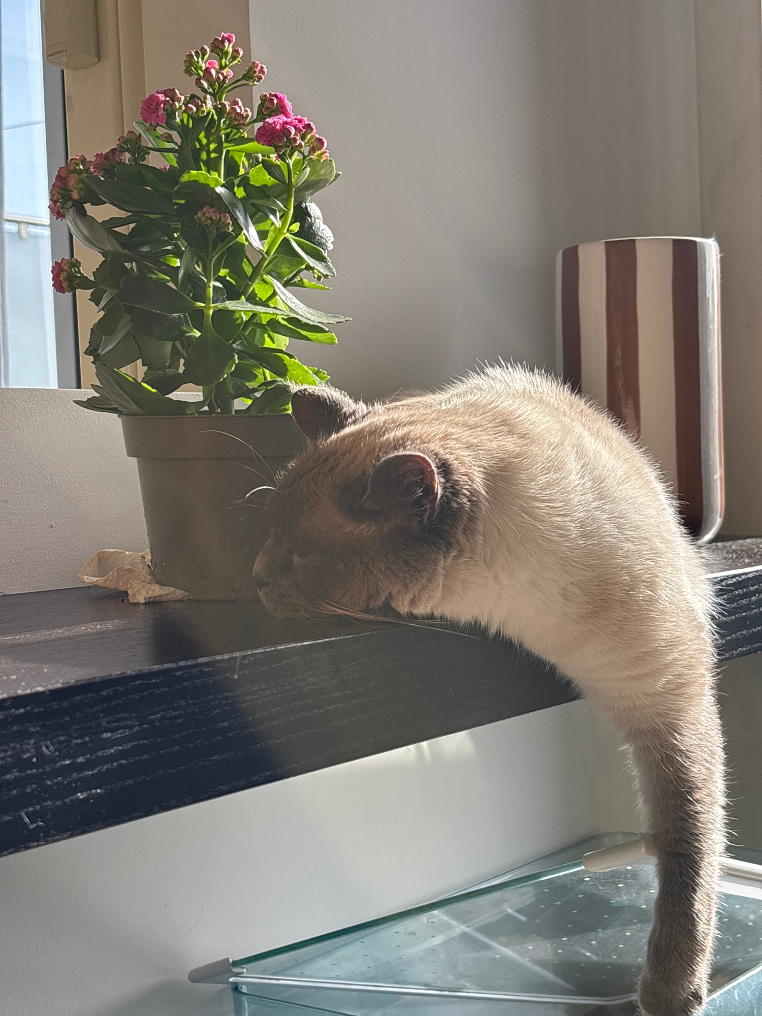 A cat is positioned on a dark brown wooden shelf, leaning down towards a potted plant with pink flowers. The cat's fur is light beige, with darker brown markings around its face and tail. A striped re…read more