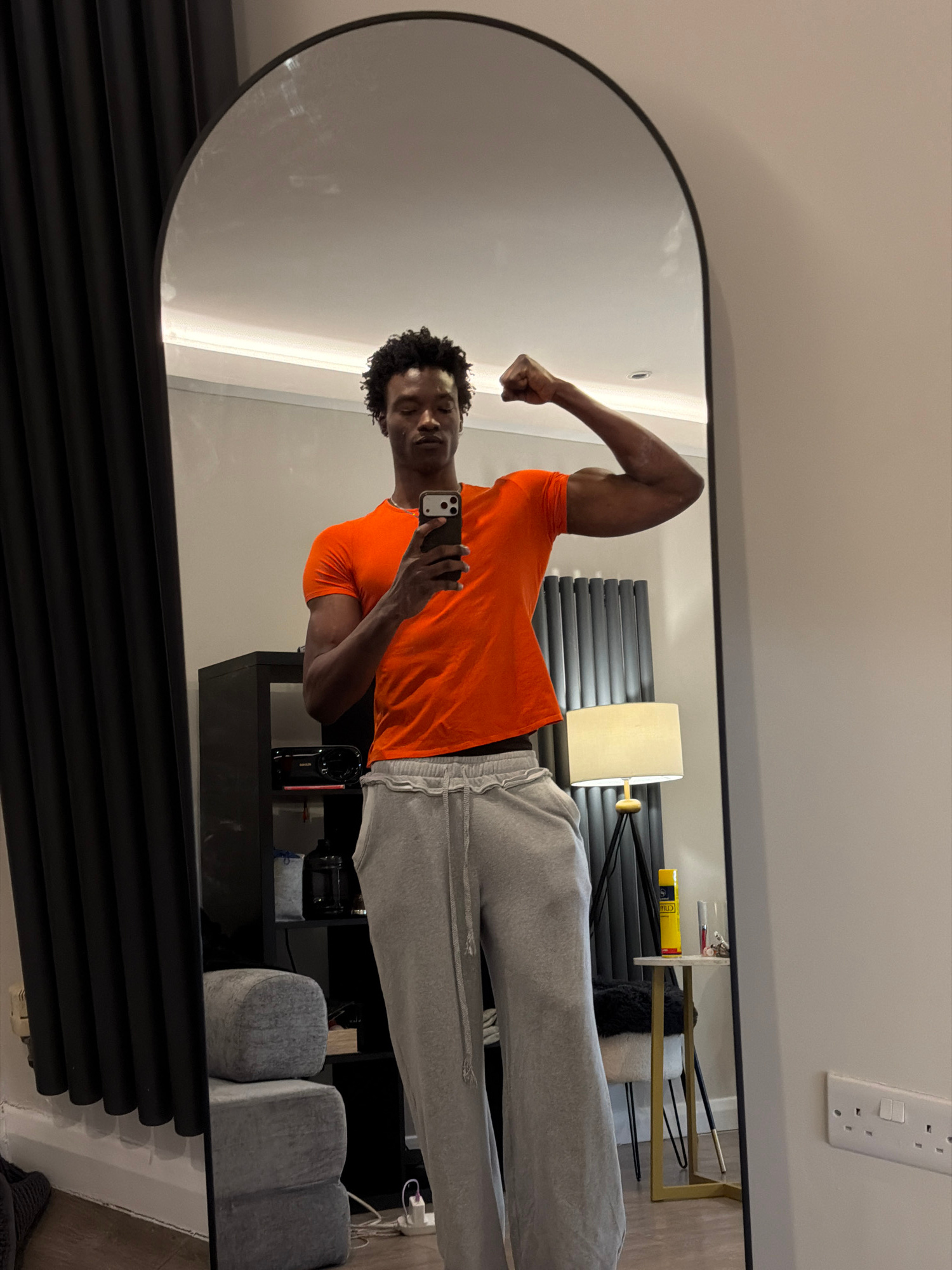 A reflection in an oval mirror shows a Black man in an orange t-shirt and gray sweatpants flexing his left bicep and holding a smartphone in his right hand, presumably taking the picture. He is positi…read more