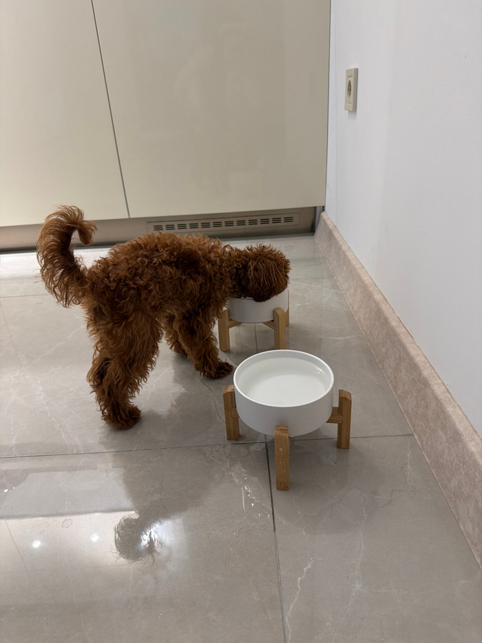 A reddish-brown poodle is seated by two white bowls, each placed in a wooden stand. The dog's tail curls upward. The bowls appear to be food and water dishes. The scene is indoors on a tiled floor, ad…read more