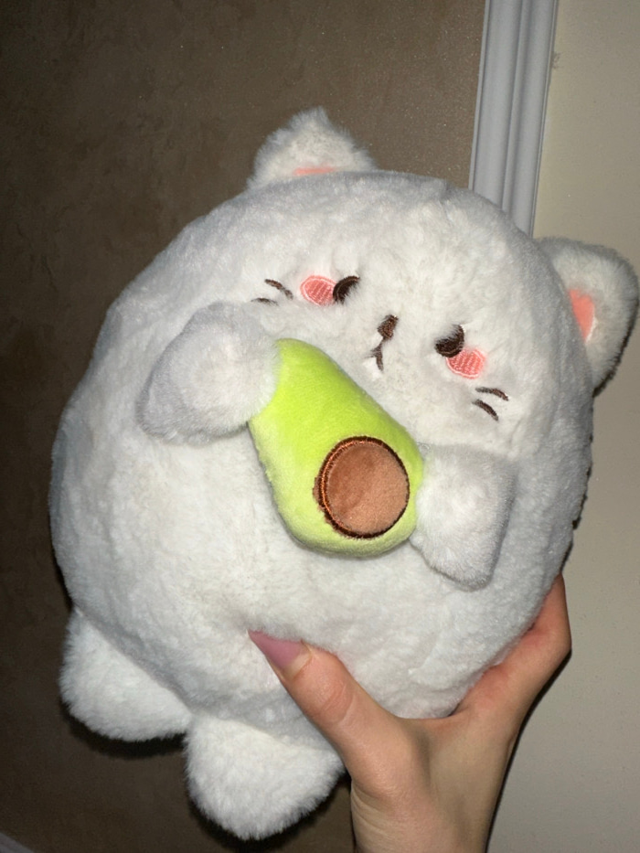 A close-up photograph displays a white, round, plush toy resembling a cat, held by a human hand. The plush cat features embroidered closed eyes with pink accents, a small brown nose, and minimal whisk…read more