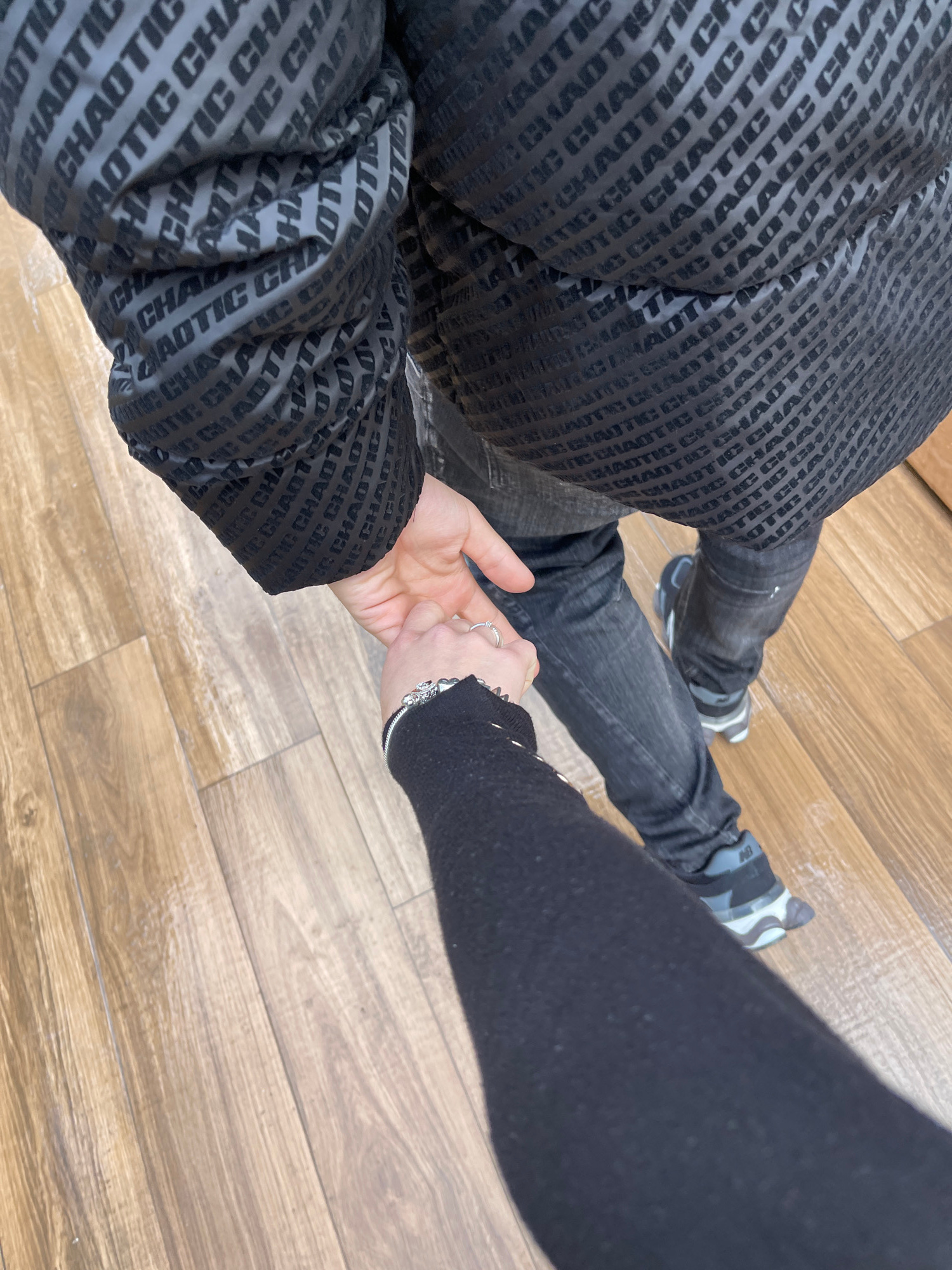 A high-angle shot shows two individuals holding hands against a backdrop of light-brown wood flooring. A person wearing black jeans, black shoes with gray and white trim, and socks with a gray and bla…read more