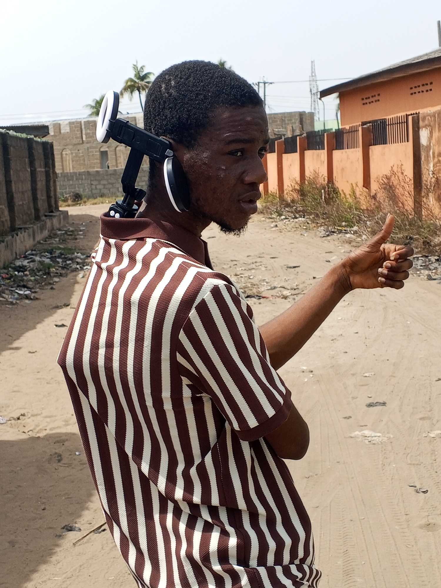 The image shows a Black man on a dirt road, giving a thumbs-up gesture with his right hand. He's wearing a vertically striped brown and white short-sleeved shirt. Affixed to his head is a black appara…read more