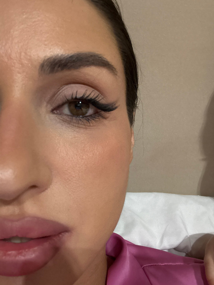 An eye-level close-up shot depicts a woman lying down with part of her face in view. Her right eye, brow, nose, and mouth are centered in the frame. The woman's eye features well-defined lashes and ey…read more
