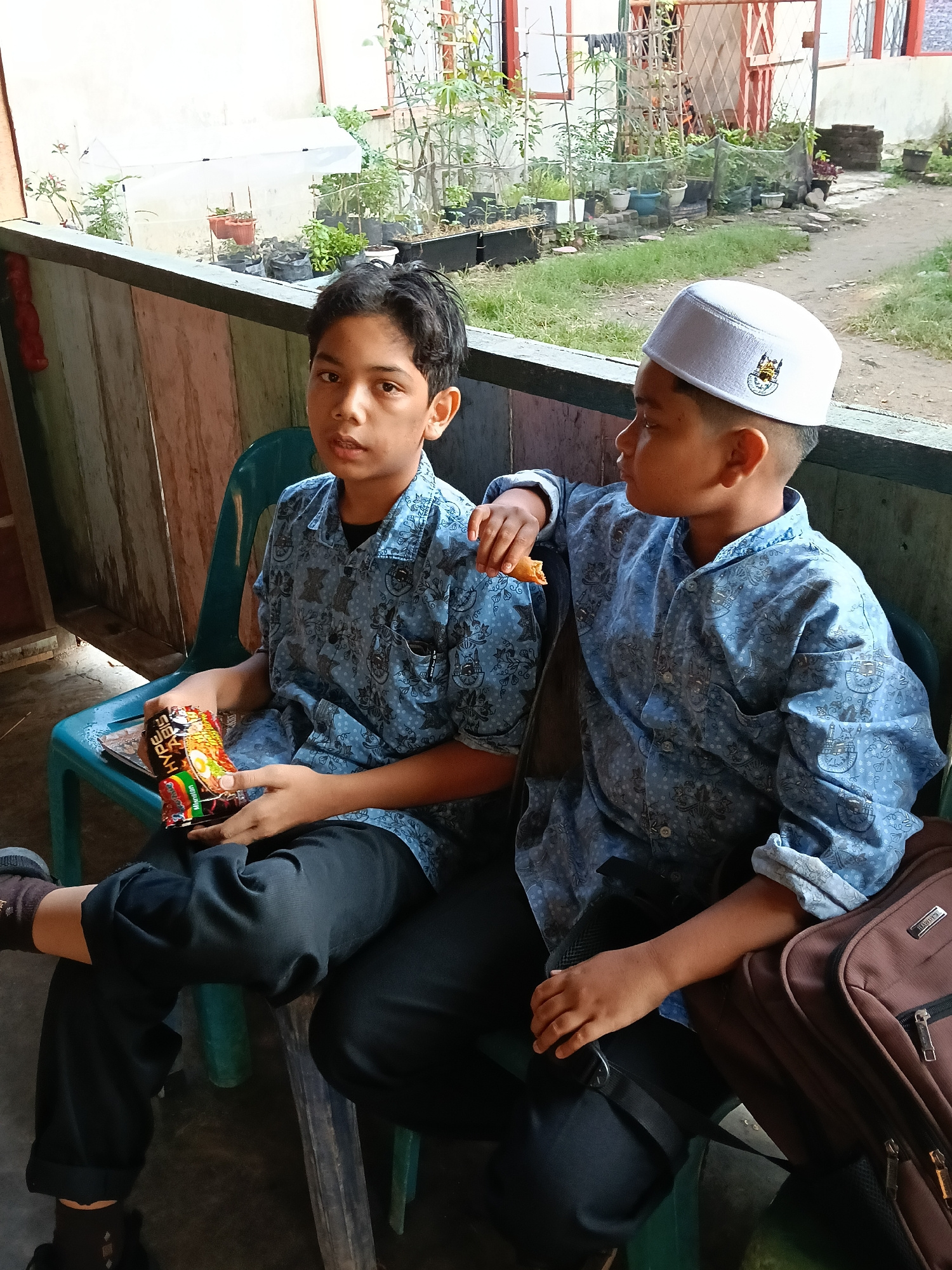 Two boys sit side by side on green plastic chairs. The boy on the left, dressed in a blue patterned shirt and black pants, holds a can of Indomie Abis instant noodles. The boy on the right, wearing a…read more