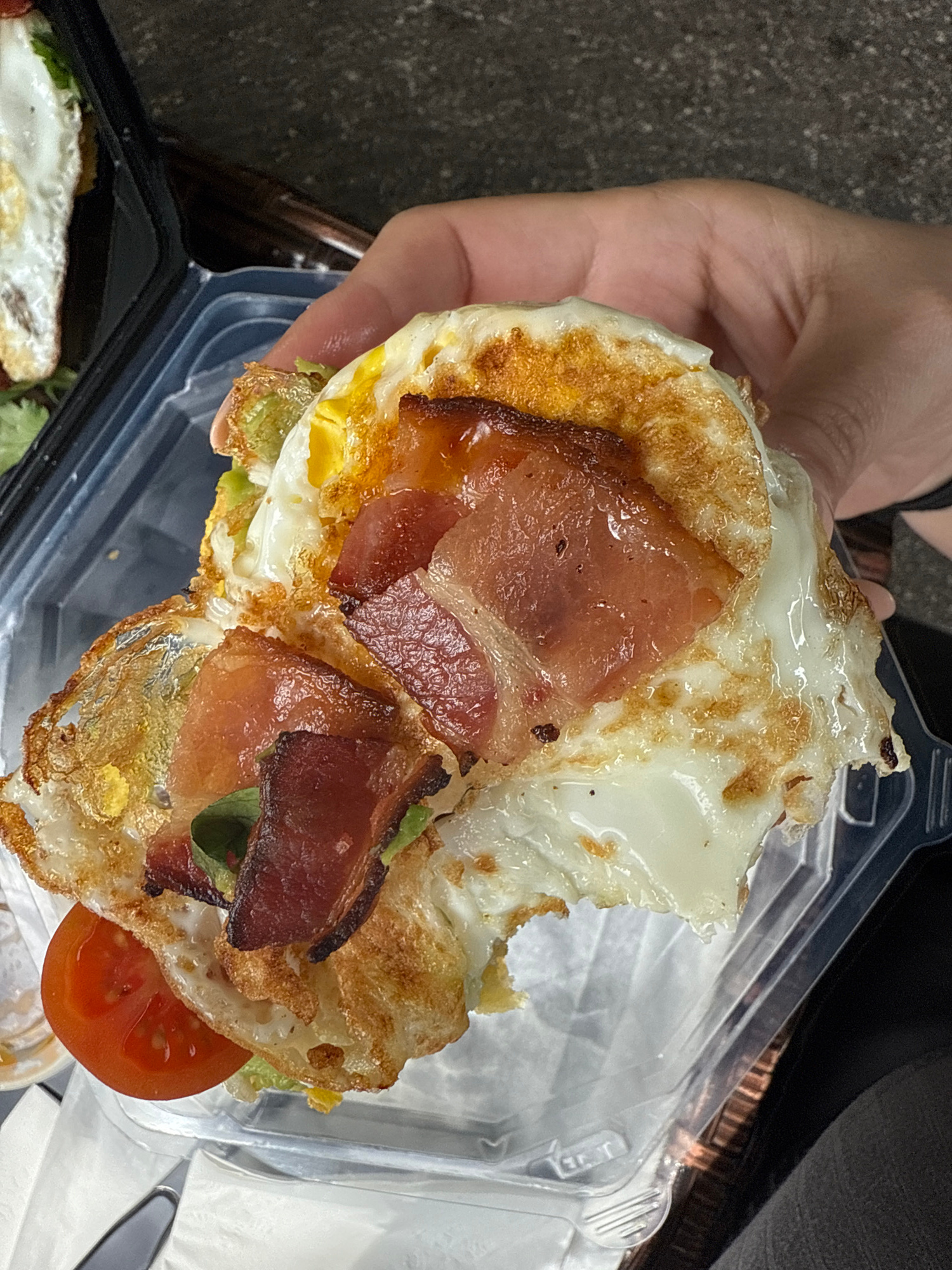 The image shows a person holding a partially eaten sandwich. The sandwich consists of two fried eggs with runny yolks, bacon, avocado, lettuce, and a slice of tomato. It is being held over a clear pla…read more