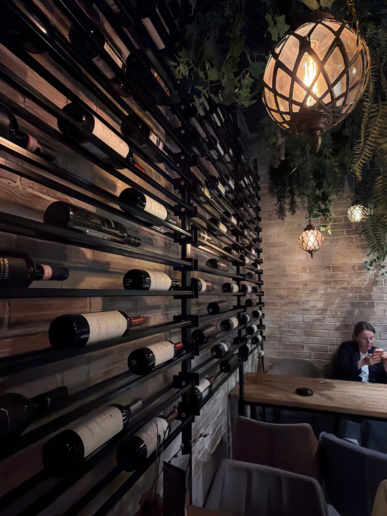 The image depicts an indoor wine rack in what appears to be a restaurant or bar. Several rows of wine bottles are displayed horizontally within a black metal rack system. A lit, caged light fixture ha…read more