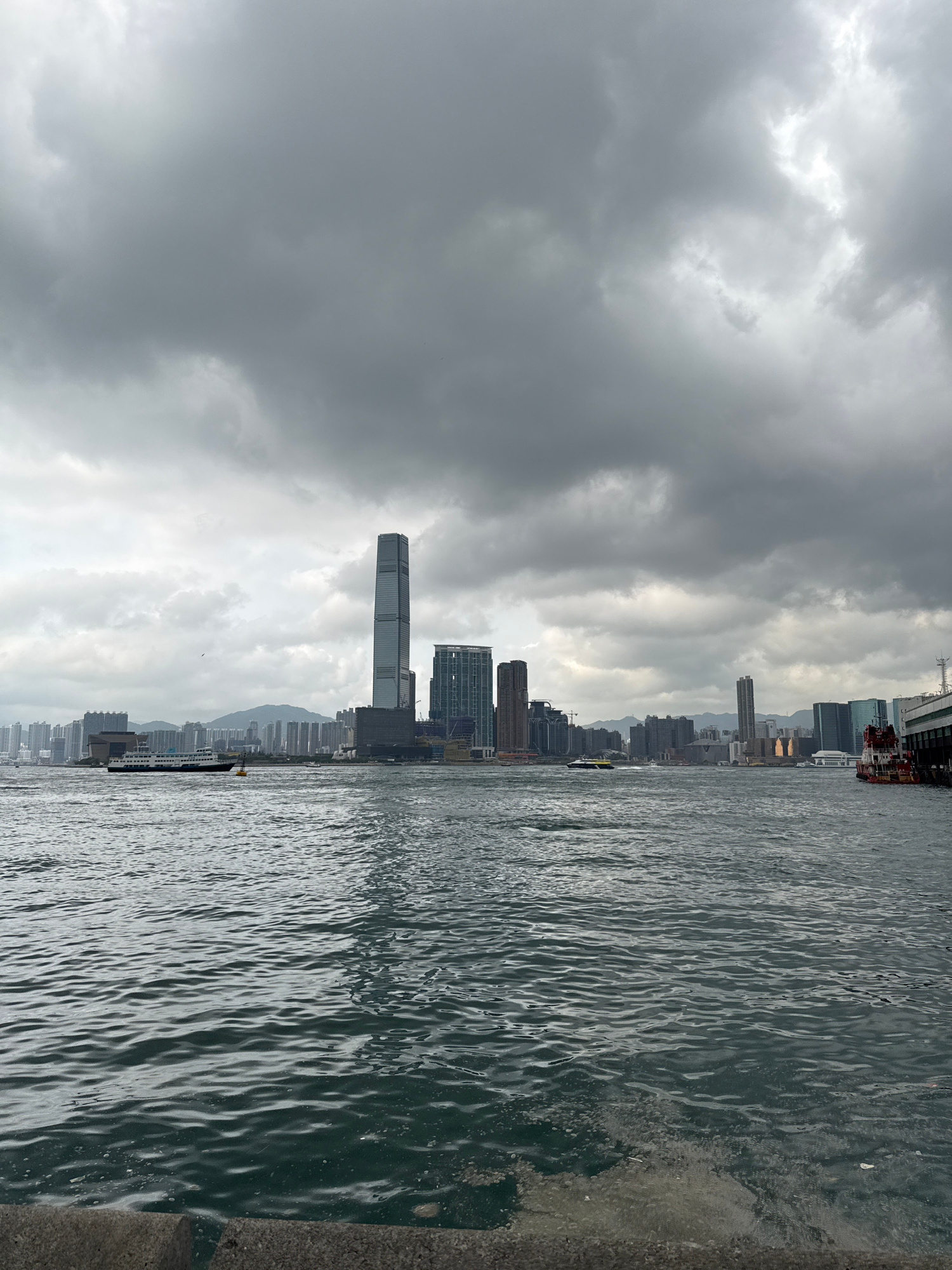 The image shows a cityscape under a cloudy sky, adjacent to a body of water. Tall buildings and skyscrapers are visible, typical of a dense urban environment. The water's surface is rippled, suggesting the presence of wind. The photograph appears to be taken from a low vantage point, close to the water's edge. The location is Hong Kong, China. | Open Wire