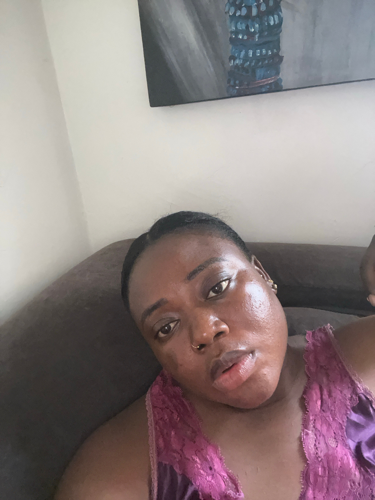 A dark-skinned woman wearing a purple lacy camisole lies on a brown sofa. A piece of art hangs on the white wall behind the sofa. It is difficult to determine the precise location in Abuja, Nigeria, w…read more