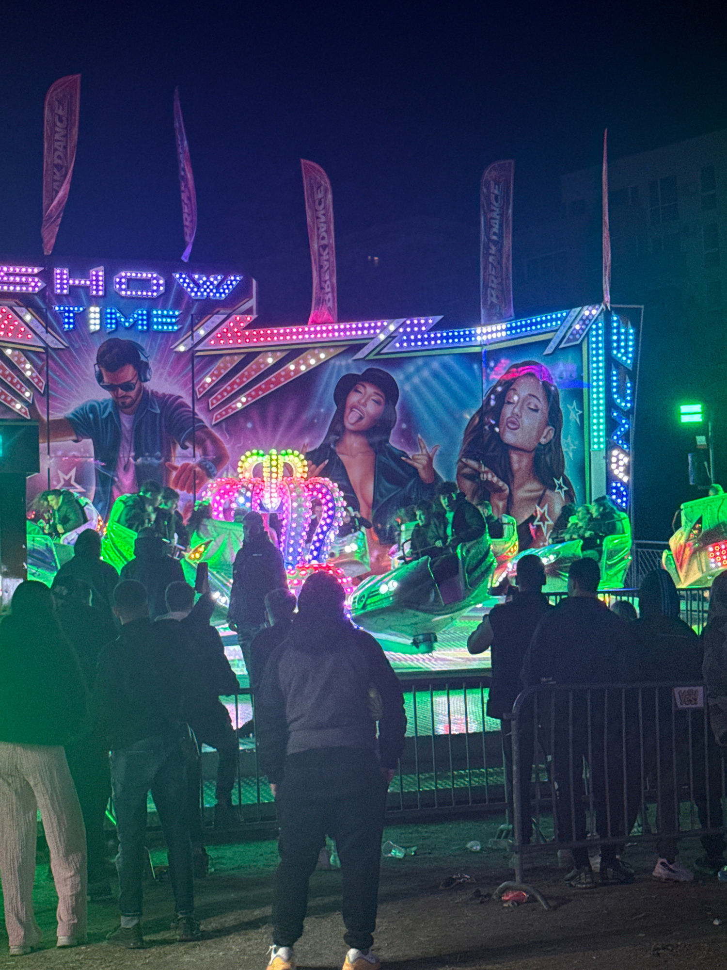 The image shows a nighttime scene at an amusement park in Plovdiv, Bulgaria. The focal point is a "Break Dance" ride, featuring vibrant neon lights, images of musicians, and spinning carriages. Severa…read more