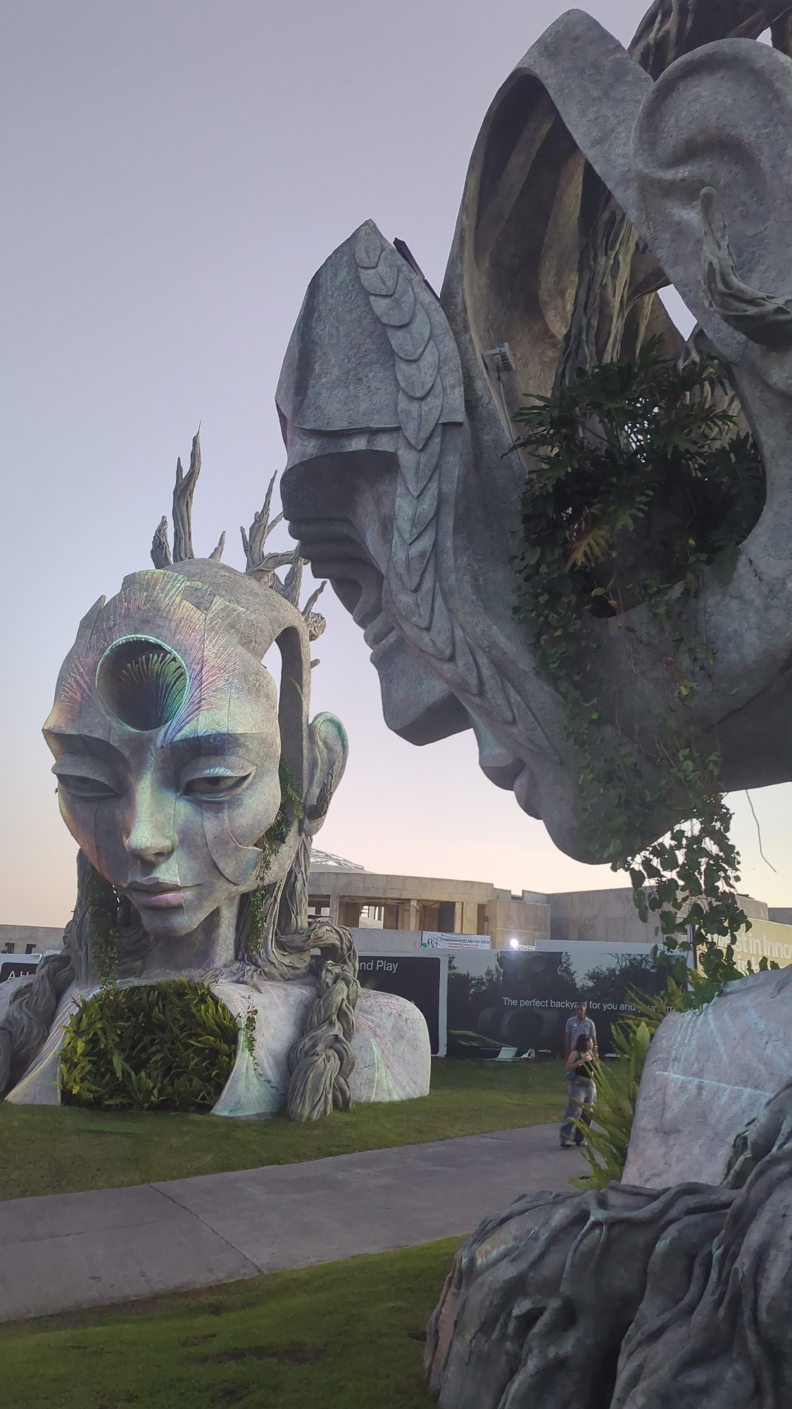 This image captures a vibrant art installation featuring monumental sculptures in an outdoor public space in Kediri, Indonesia. The primary subjects are two massive, stylized head sculptures, appeari…read more