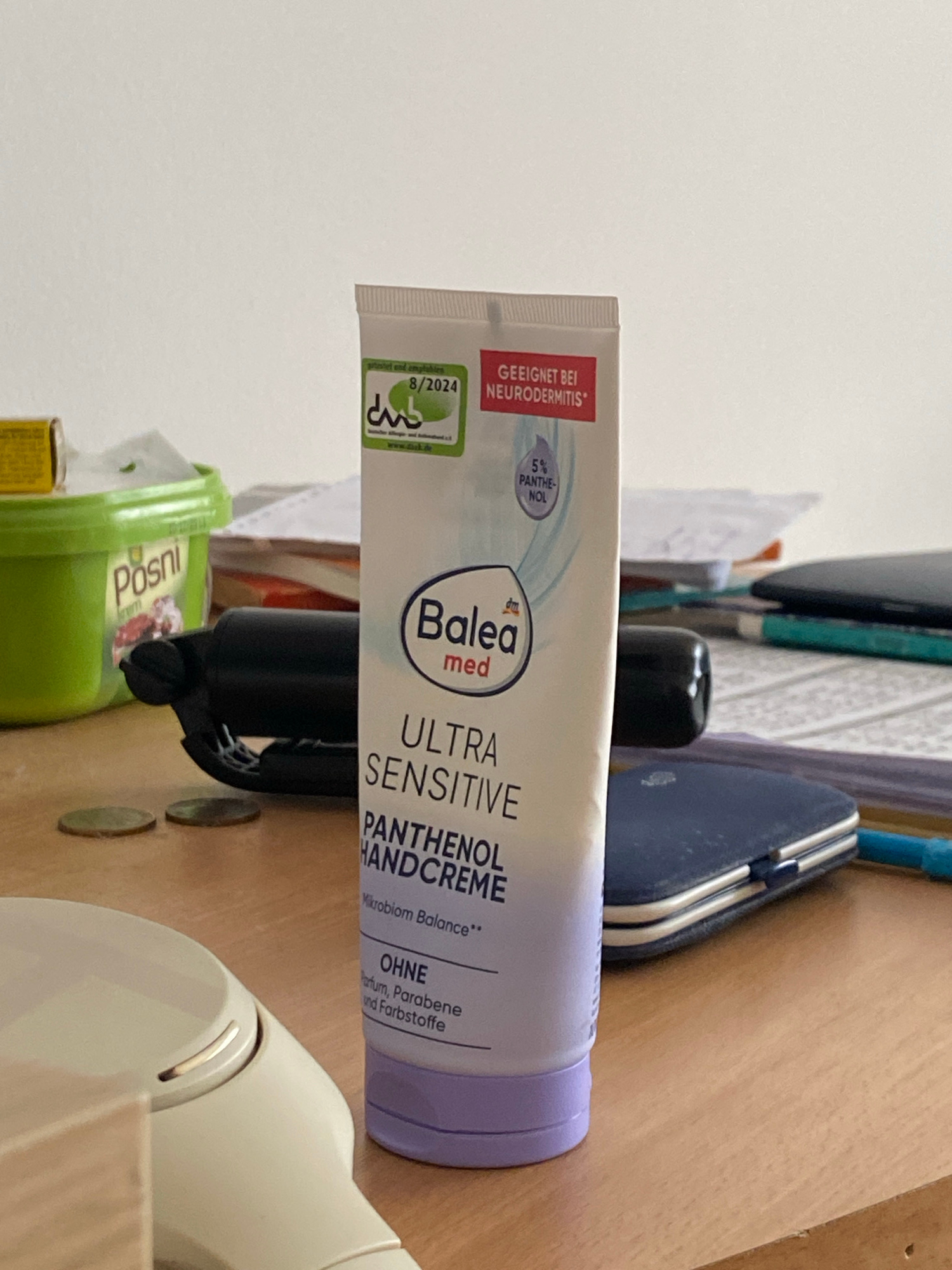 The image shows a partially rotated view of a table surface. On the table, there's a tube of Balea Med Ultra Sensitive Panthenol Handcreme, positioned horizontally in the center. The hand cream tube h…read more