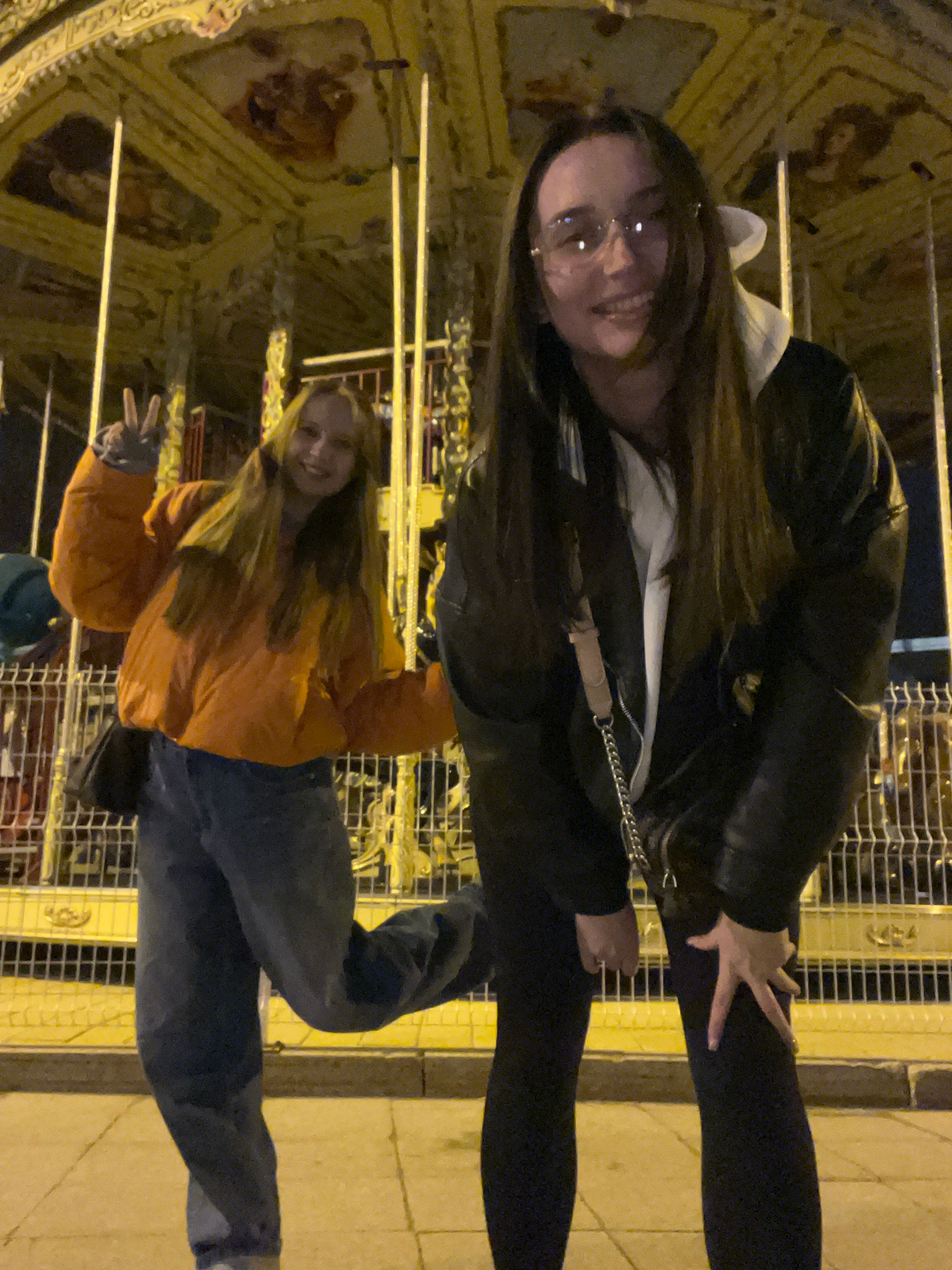 The image depicts two women standing in an outdoor setting at night, likely in Tyumen, Russia, given the presence of a carousel visible in the background. The woman on the left wears a black leather j…read more