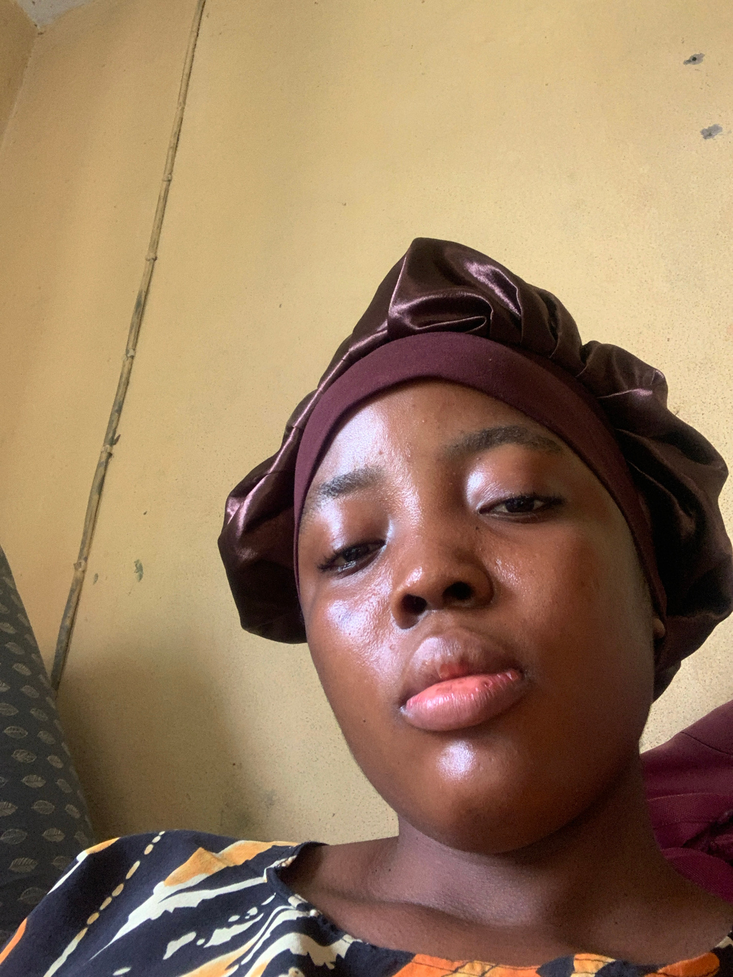 A close-up photo shows a woman with dark skin wearing a satin brown hair bonnet. She has full lips and shiny skin. She is wearing a dark-colored, patterned top with orange and white details. The backg…read more