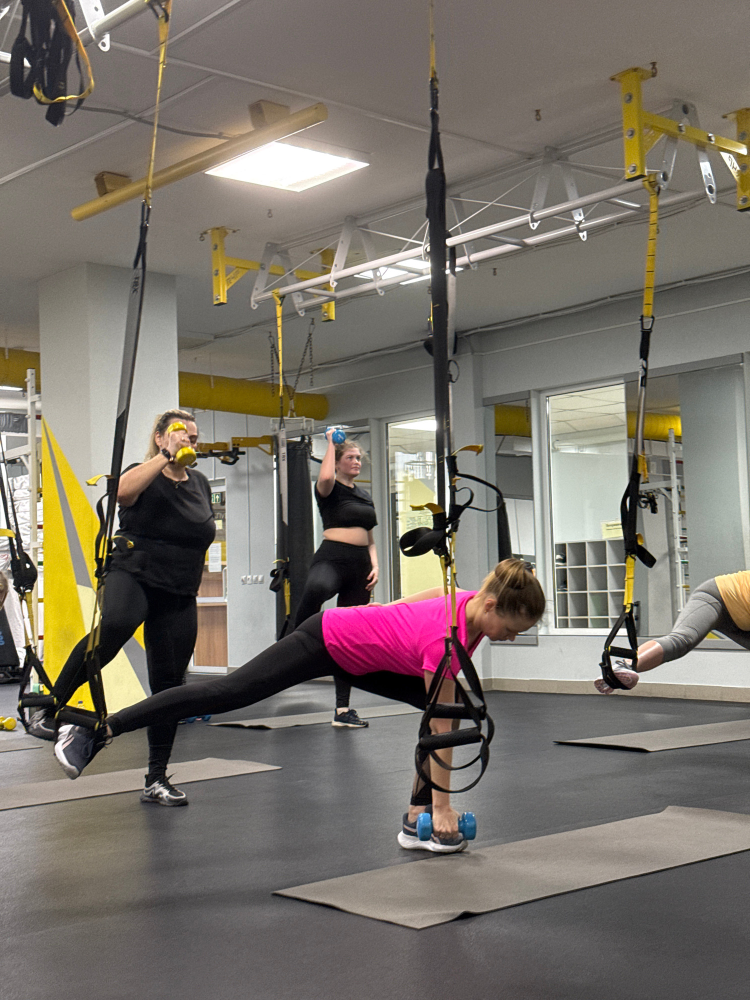 Three women are exercising with TRX suspension trainers in what appears to be a gym. The gym has a gray floor and a white ceiling with yellow support structures for the suspension trainers. The woman…read more