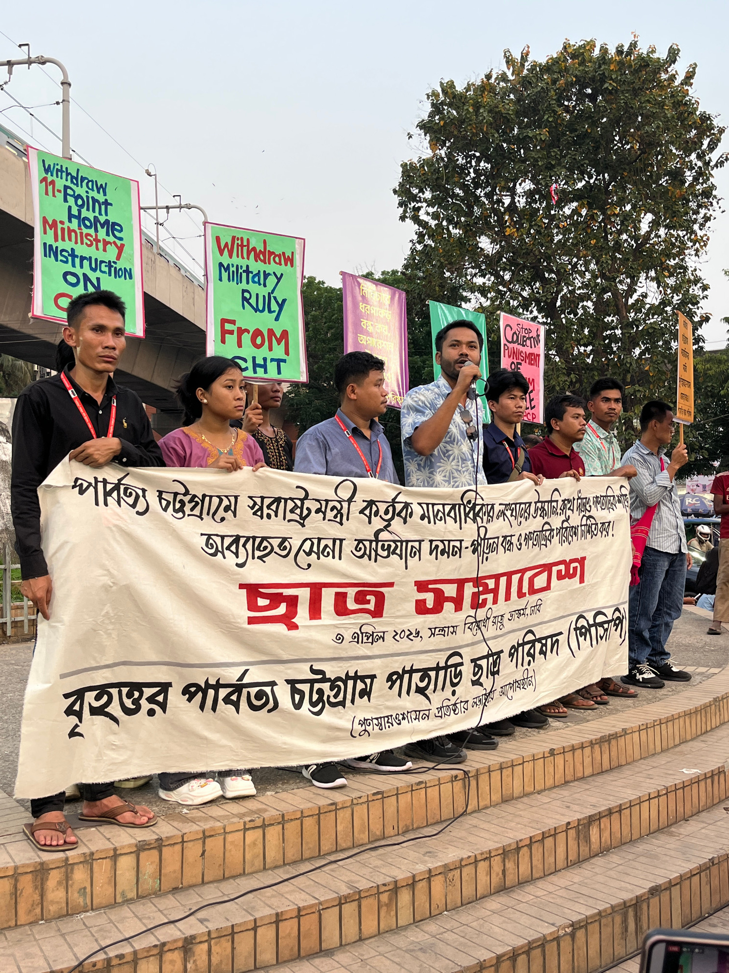 A group of people are protesting in what appears to be Dhaka, Bangladesh. They stand on a staircase, holding signs and a large banner. One sign reads "Withdraw 11-Point Home Ministry Instruction ON".…read more